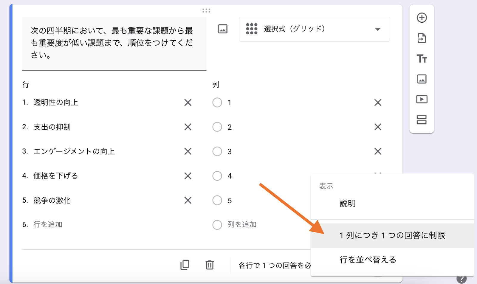 - 次に、回答者が各順位を1つの選択肢としか組み合わせられないようにします。そうしなければ、回答者が誤って複数の選択肢に同じ順位をつけてしまい、データの正当性を失う可能性があります。これを行うには、トグルの隣にある3つのドットのアイコンをクリックして、新しいメニューを開きましょう。そして、「1列につき1つの回答に制限」を選択します。これで、回答者が複数の選択肢に対して同じ順位を選択しようとした場合に、エラーメッセージが表示されるようになります。