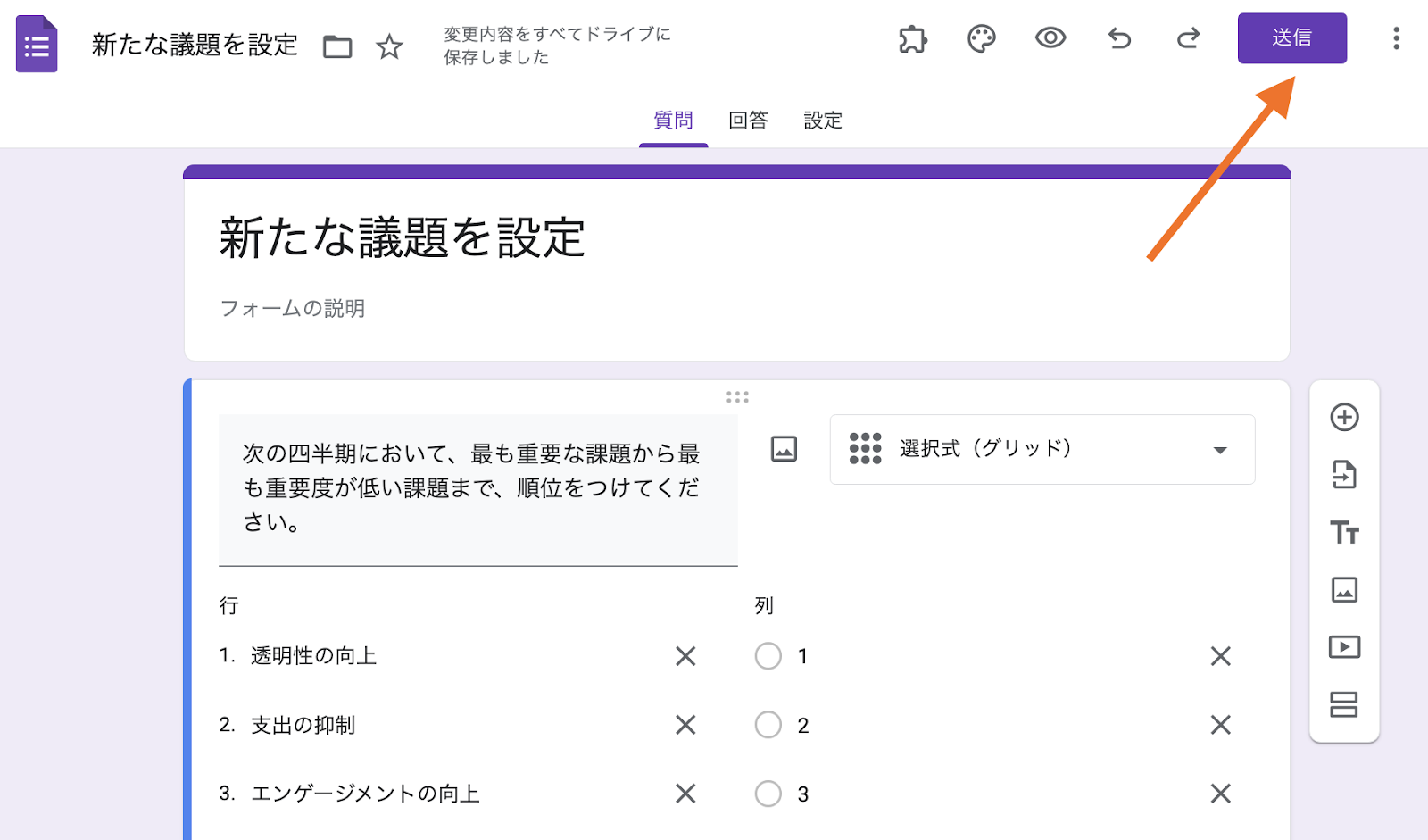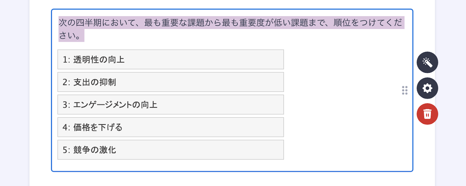 - 質問欄に順位付けの質問を追加します。例えば、次の任期でリーダーが取り組むべき課題についてアンケートを実施する場合、次のように質問しましょう:「次の四半期において、最も重要な課題から最も重要度が低い課題まで、順位をつけてください。」
