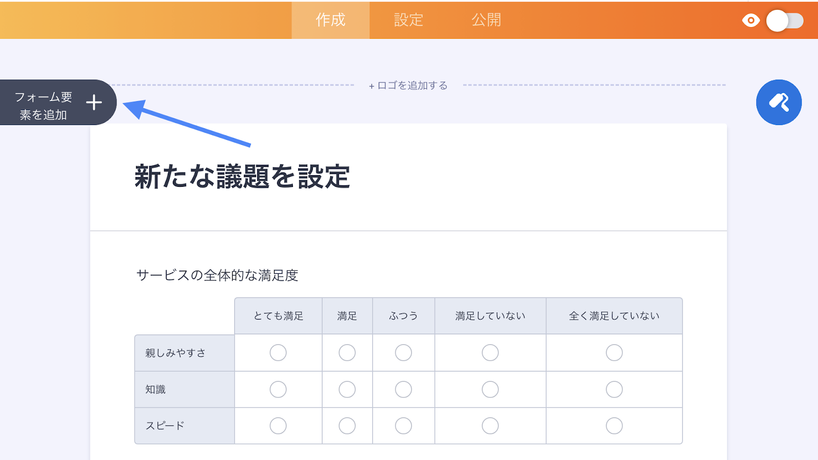 - 画面左上の「フォーム要素を追加」ボタンをクリックし、フォーム要素メニューを開きます。