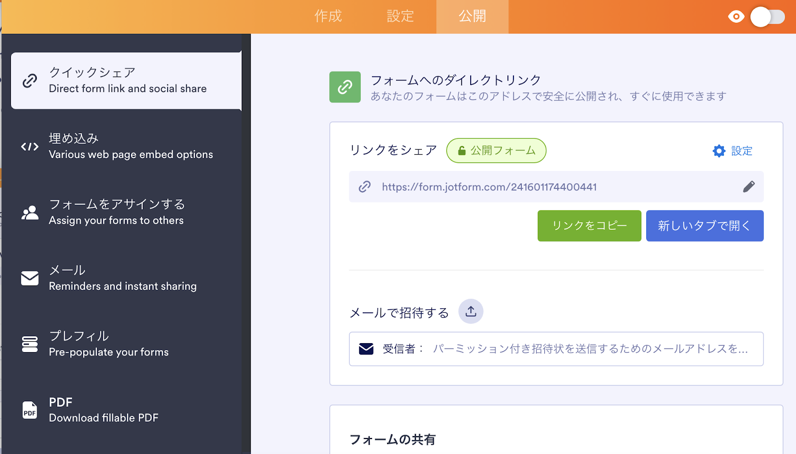 - 公開ボタンをクリックすれば、アンケートは準備完了です。Jotformが自動的にリンクを生成し、フォームを誰とでも簡単に共有できるようにしてくれます。公開タブでは、フォームをメールで送信したり、QRコードを作成して共有したり、ウェブサイトに埋め込んだりするオプションも表示されます。