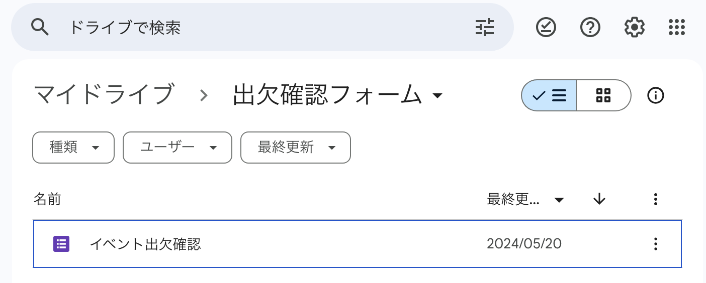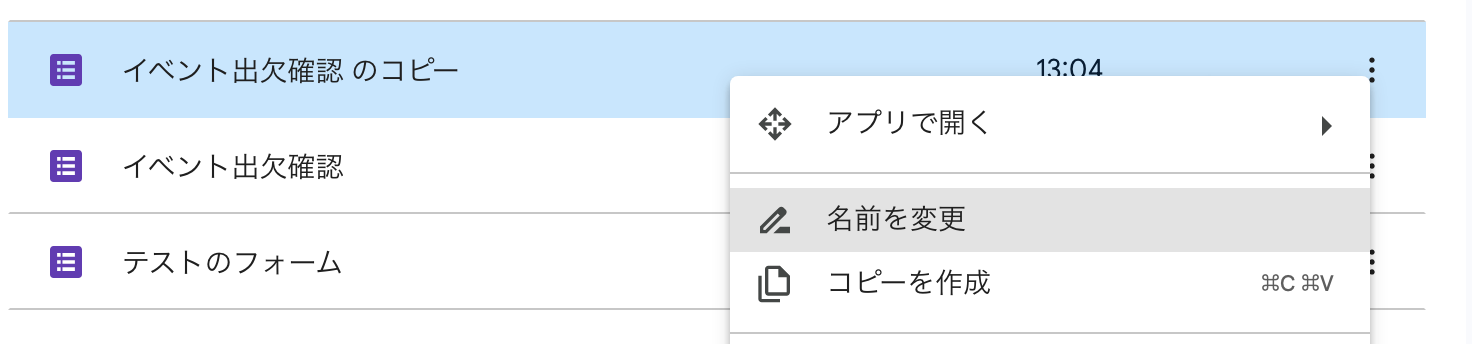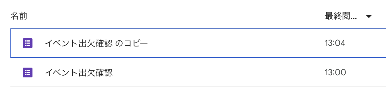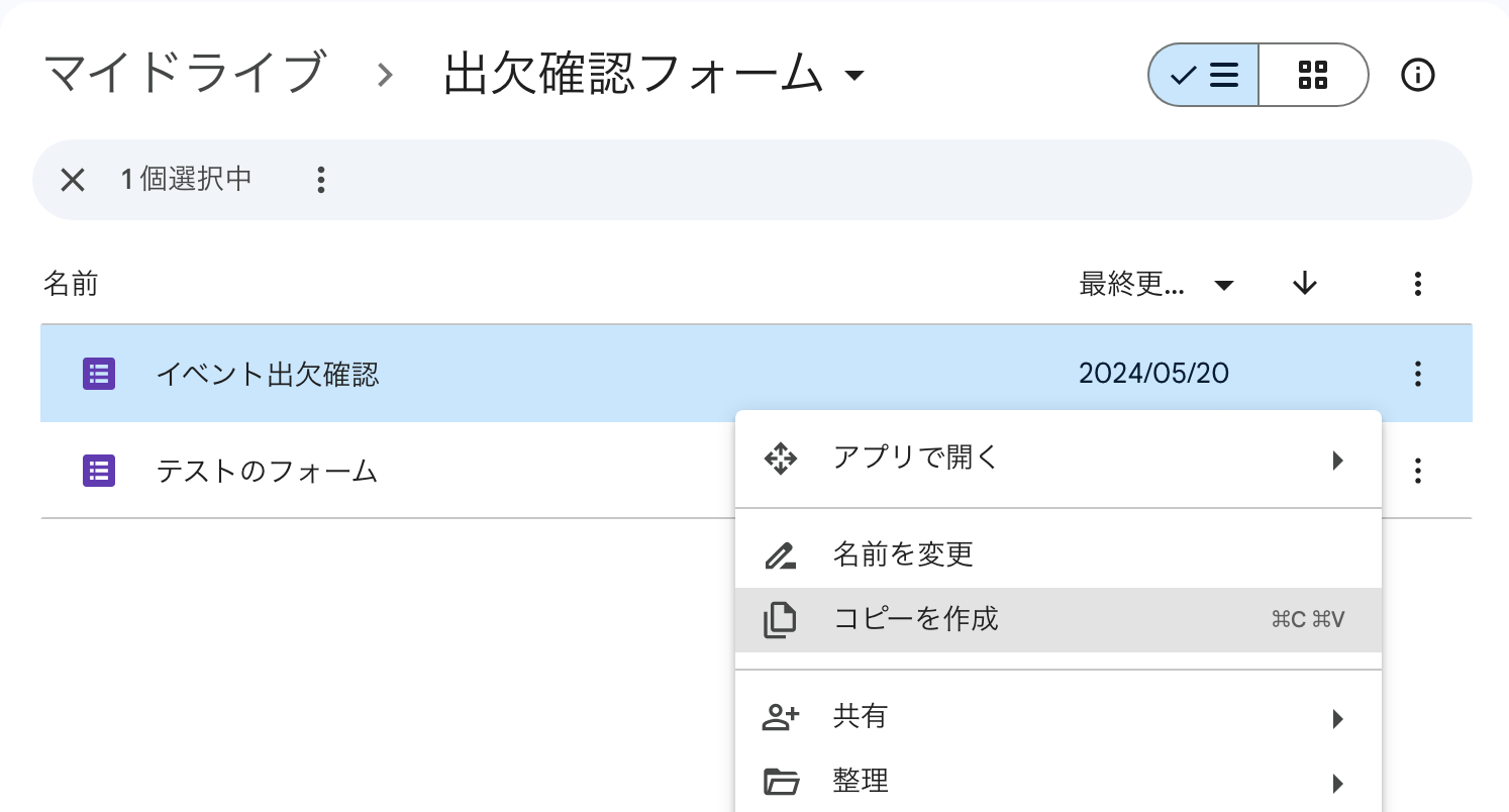 Googleドライブ上で、コピーしたいフォームに移動します。