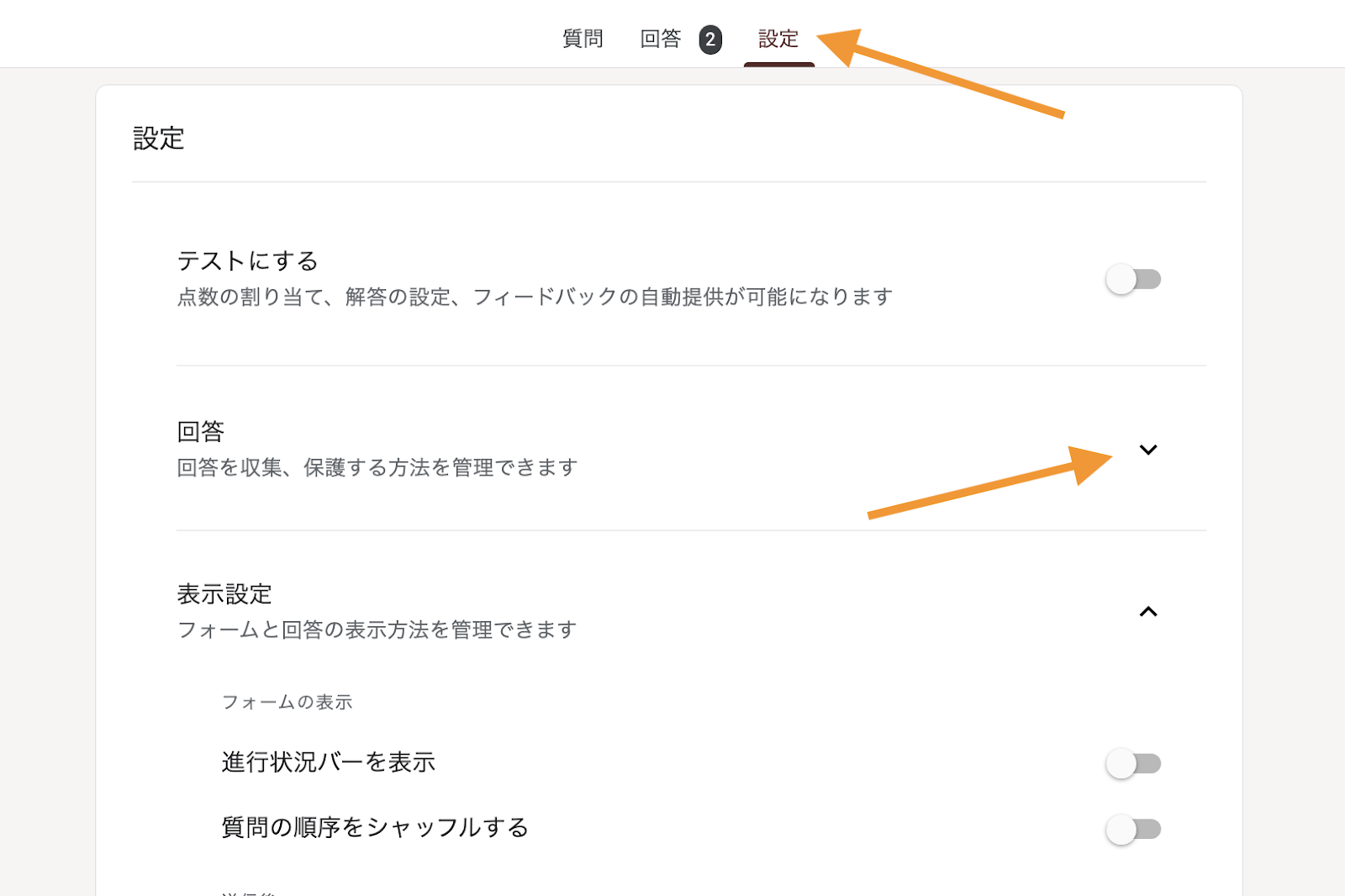 - 「設定」タブで、「回答」をクリックします。