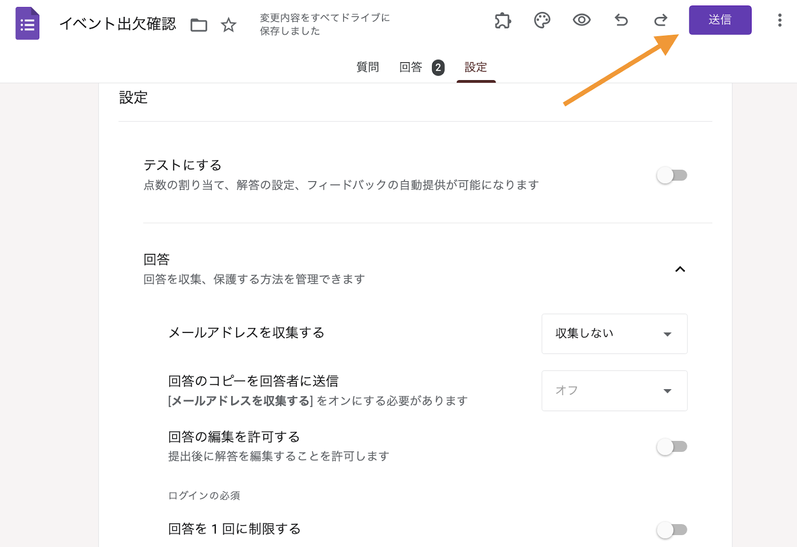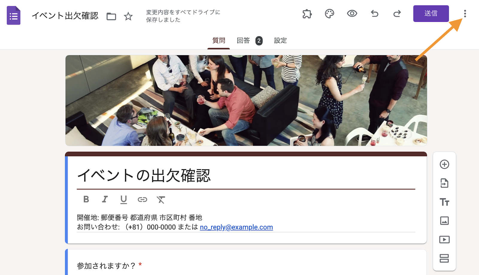 - フォームを共有するには、右上の「送信」ボタンをクリックしてください。