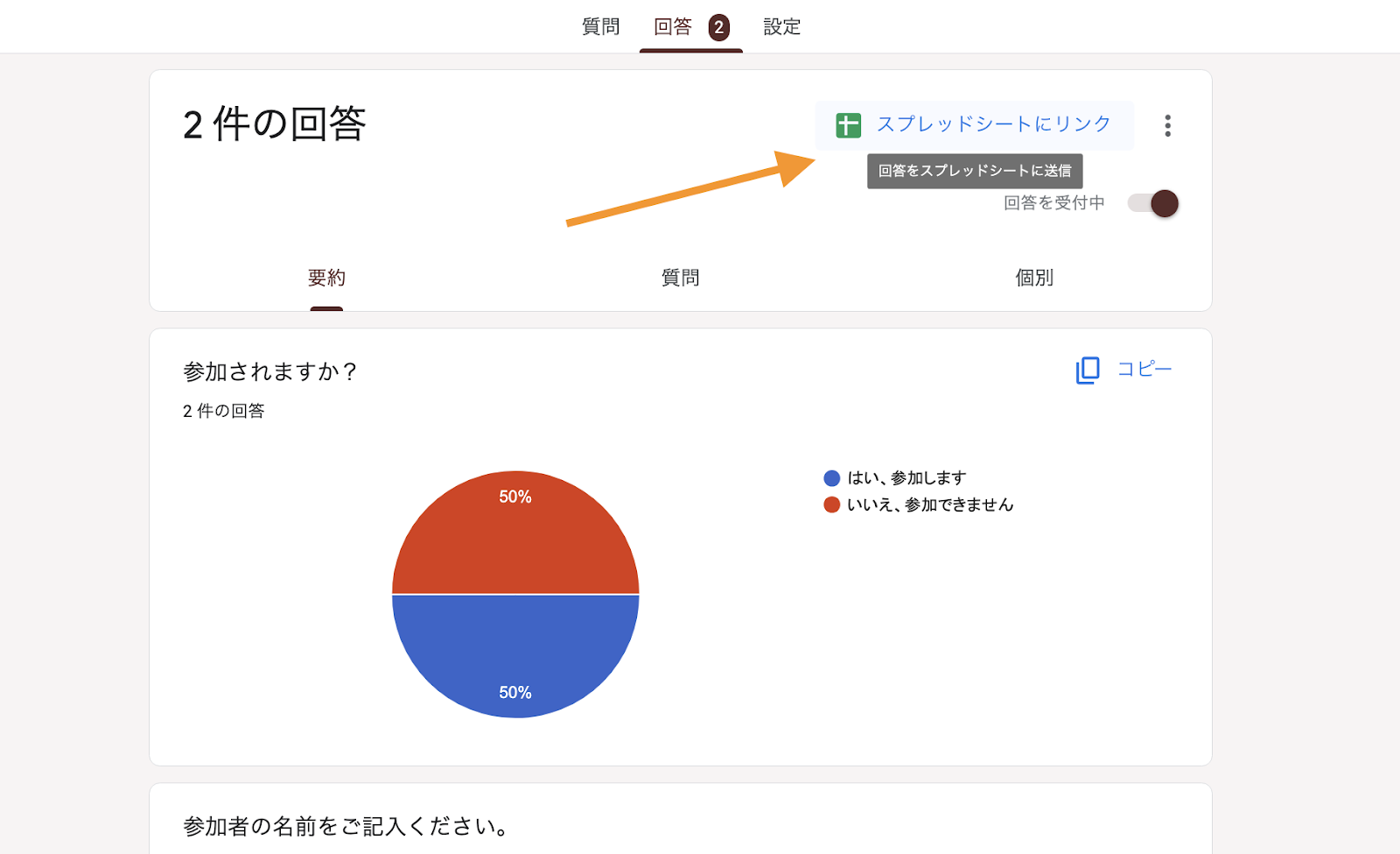 - また、「回答」タブをクリックし、緑色のスプレッドシートアイコンをクリックすると、Google シートで回答を追跡および管理できます。