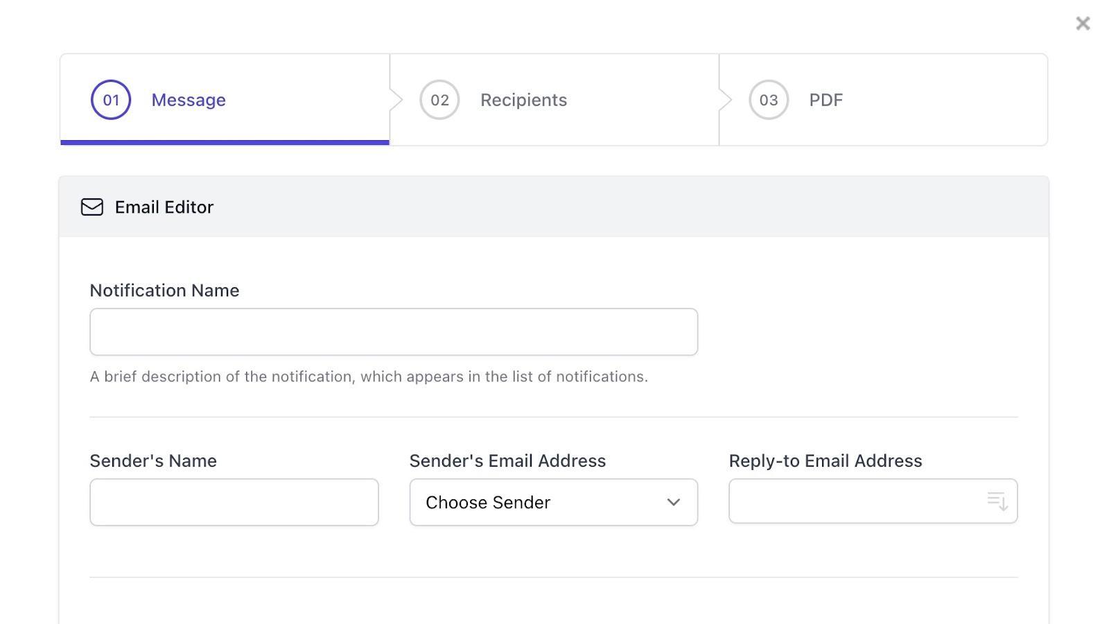 - 簡単に識別できるように、「Notification Name」の部分に通知の名前を入力しましょう。通知を送信したいメールアドレス(カスタマーサポートチームなど)、送信者名、メールアドレスを追加します。