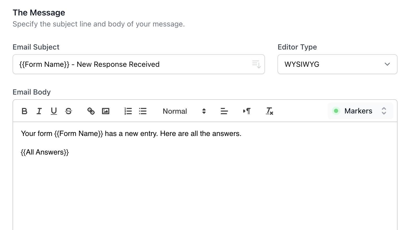 - デフォルトでは、フォームへのすべての回答がメールの本文に表示されますが、必要に応じてメールをカスタマイズできます。