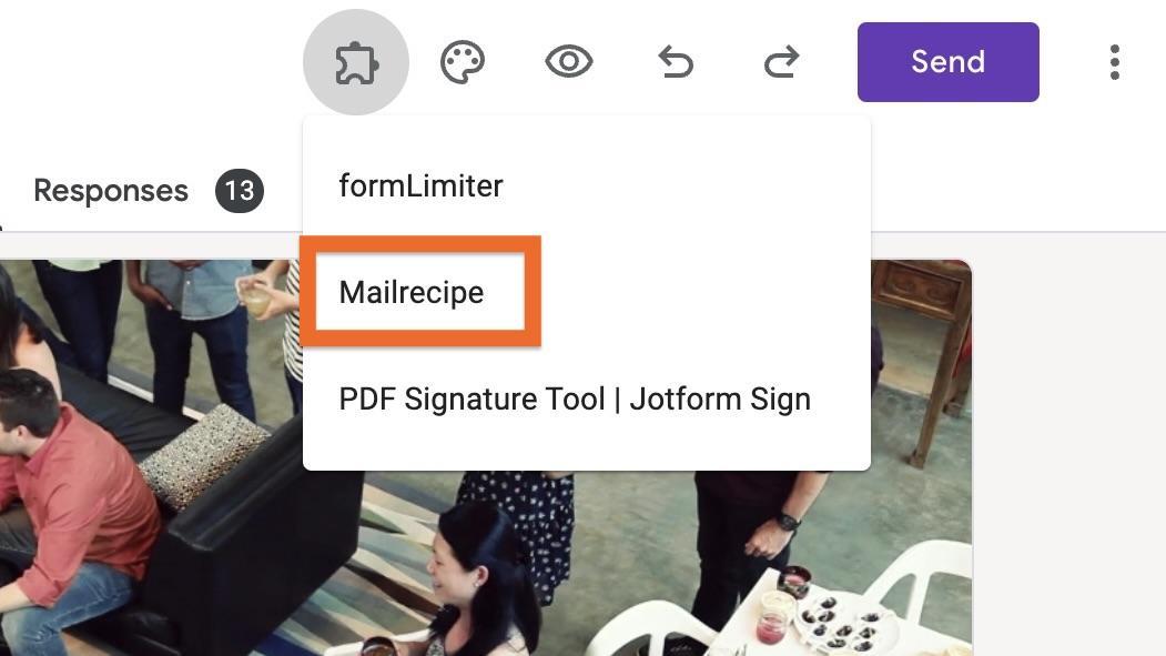 - フォームに移動し、アドオンアイコン (パズルのピース) をクリックします。「Email Notification for Google Forms」をクリックし、「Open App」をクリックします。