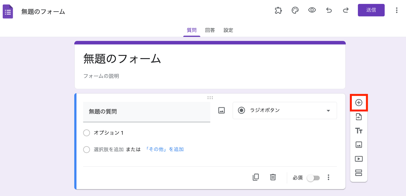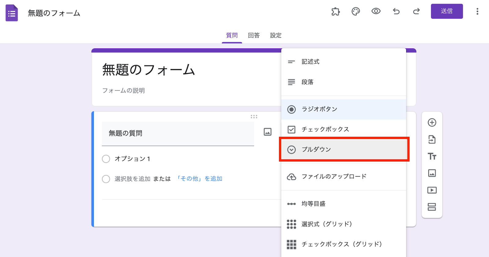 フォーム上でプルダウンリストを追加したい質問をクリックするか、右側に表示されたメニューバーのプラスアイコンをクリックして新しい質問を追加します。そして、質問フィールドの右上にあるボックスをクリックしてください。
