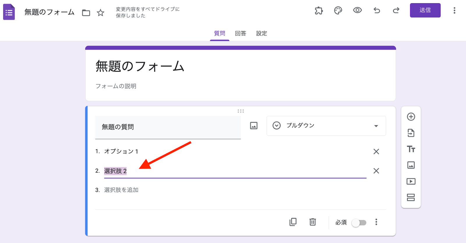 「選択肢を追加」をクリックして、プルダウンリストに項目を追加できます。テキストを編集するには、編集したい部分をクリックしましょう。
