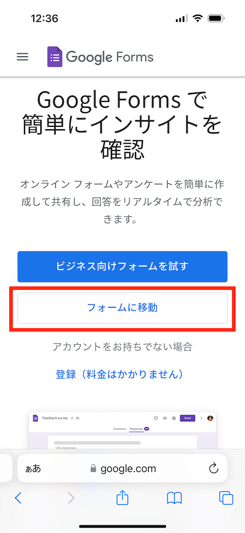まず、モバイル端末でウェブブラウザを開き、Googleフォームにアクセスします。次に「フォームに移動」をタップします。