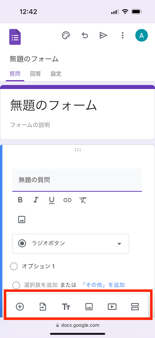 デスクトップ版のGoogleフォームを使ったことがある人なら、この画面は見慣れていることでしょう。