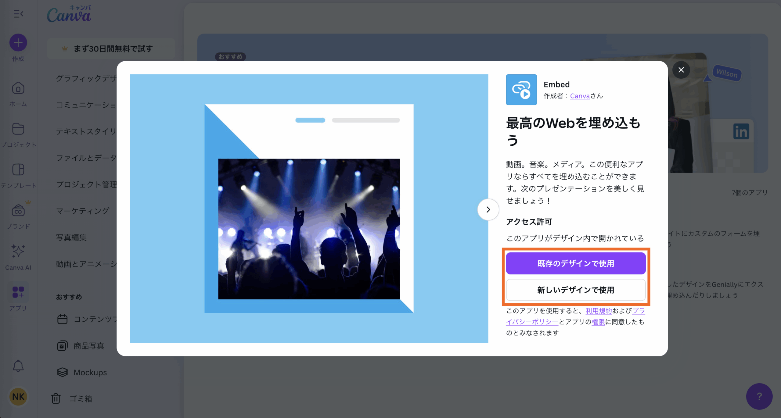 - 埋め込みアプリ内で、既存のデザインで使用、もしくは新しいデザインで使用を選択します。