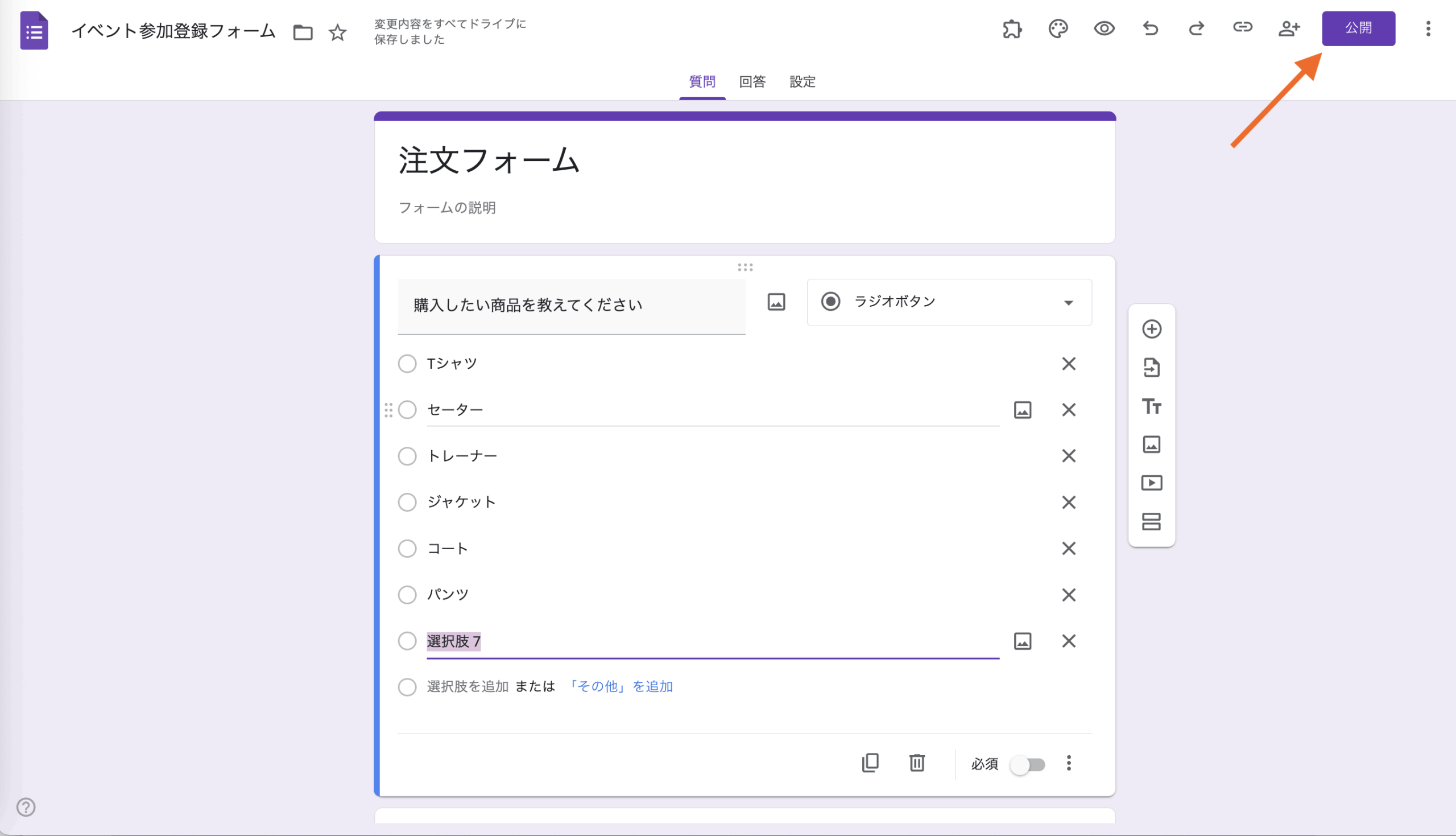 - Googleフォームが完成したら、画面右上の公開ボタンをクリックし、続けてもう一度公開をクリックします。