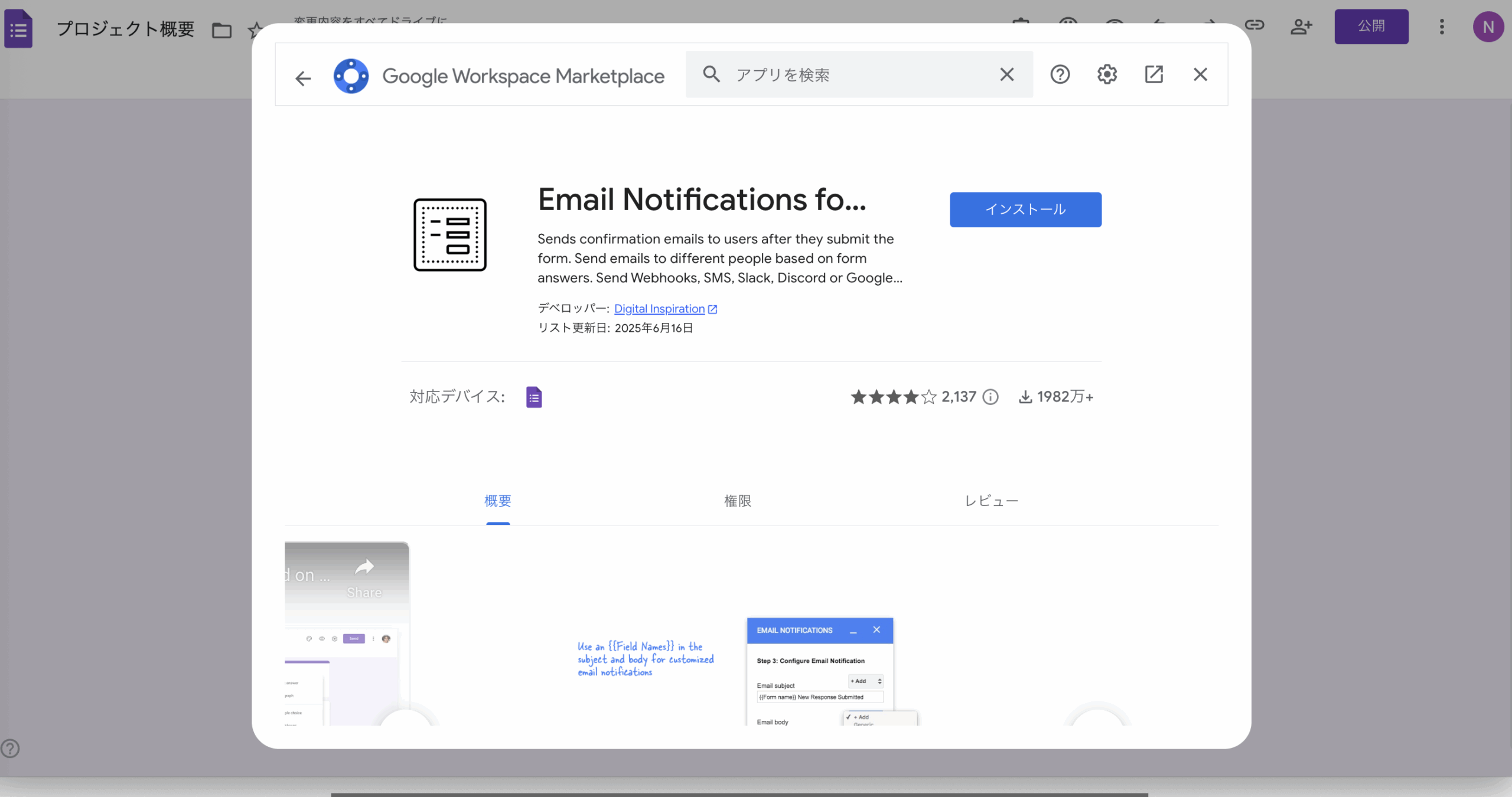 - Email Notifications for Formsアドオンを検索し、ダウンロードします。