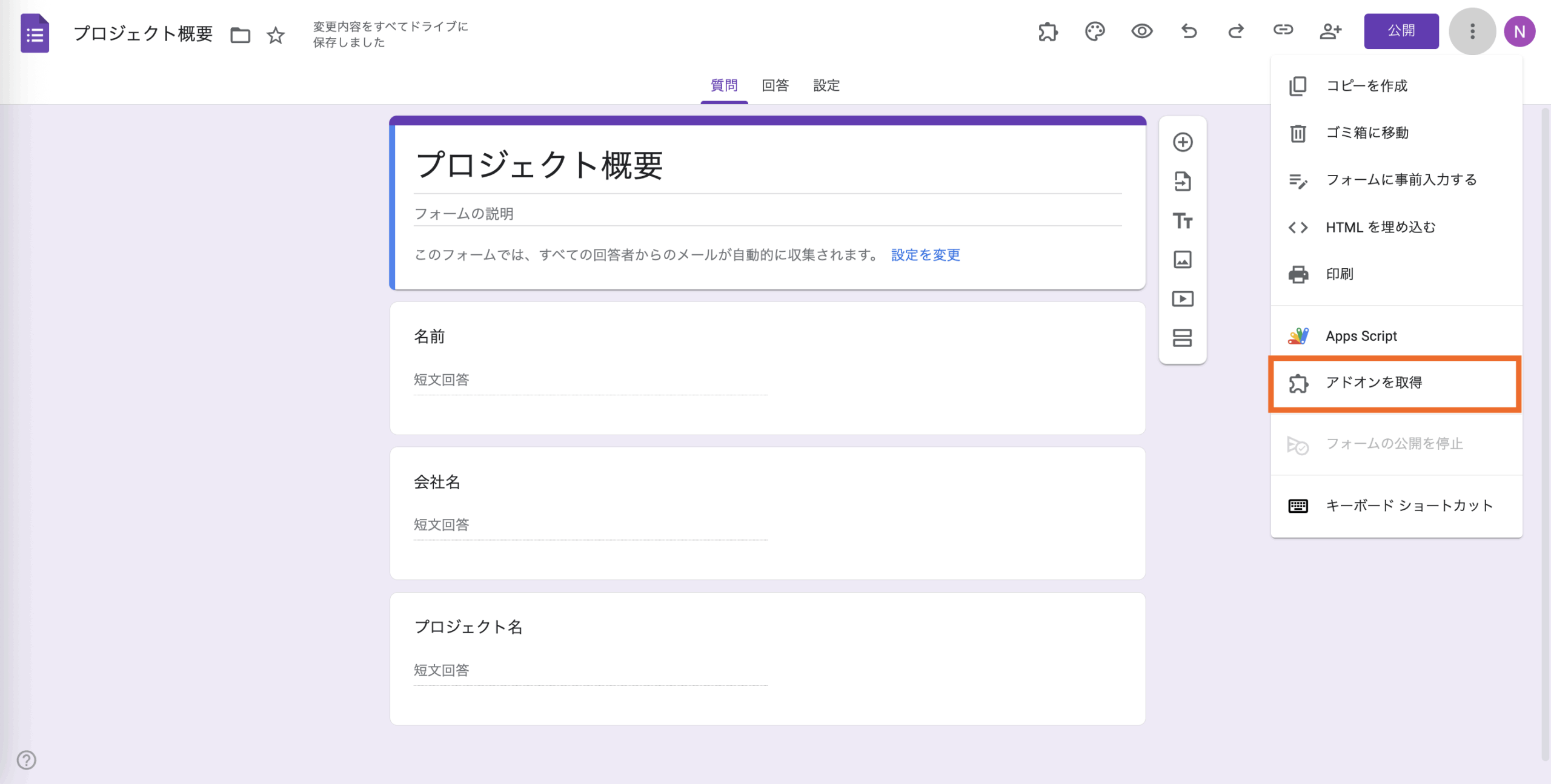 - フォームの上部にあるパズルピースのアドオンアイコンを選択し、Google フォームの Email Notificationsを選択します。
