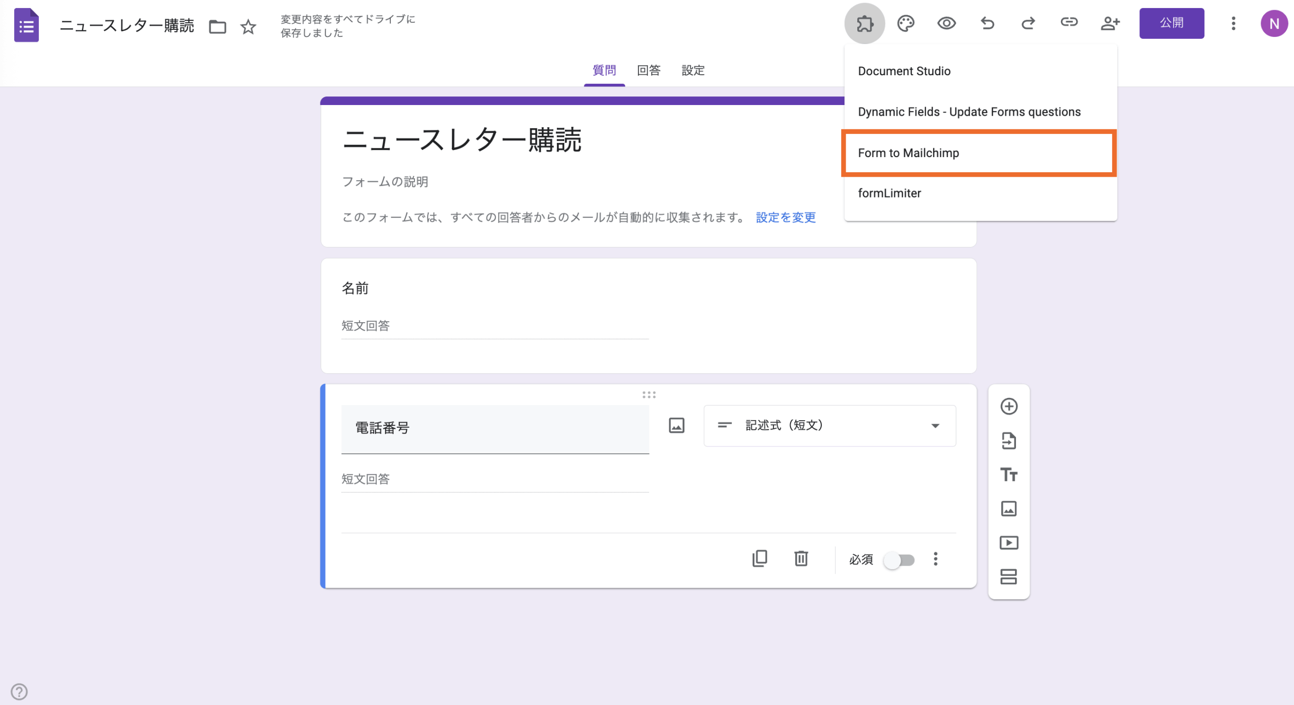 - Googleフォームを開き、画面右上にあるForm to Mailchimpというアドオンオプションを確認