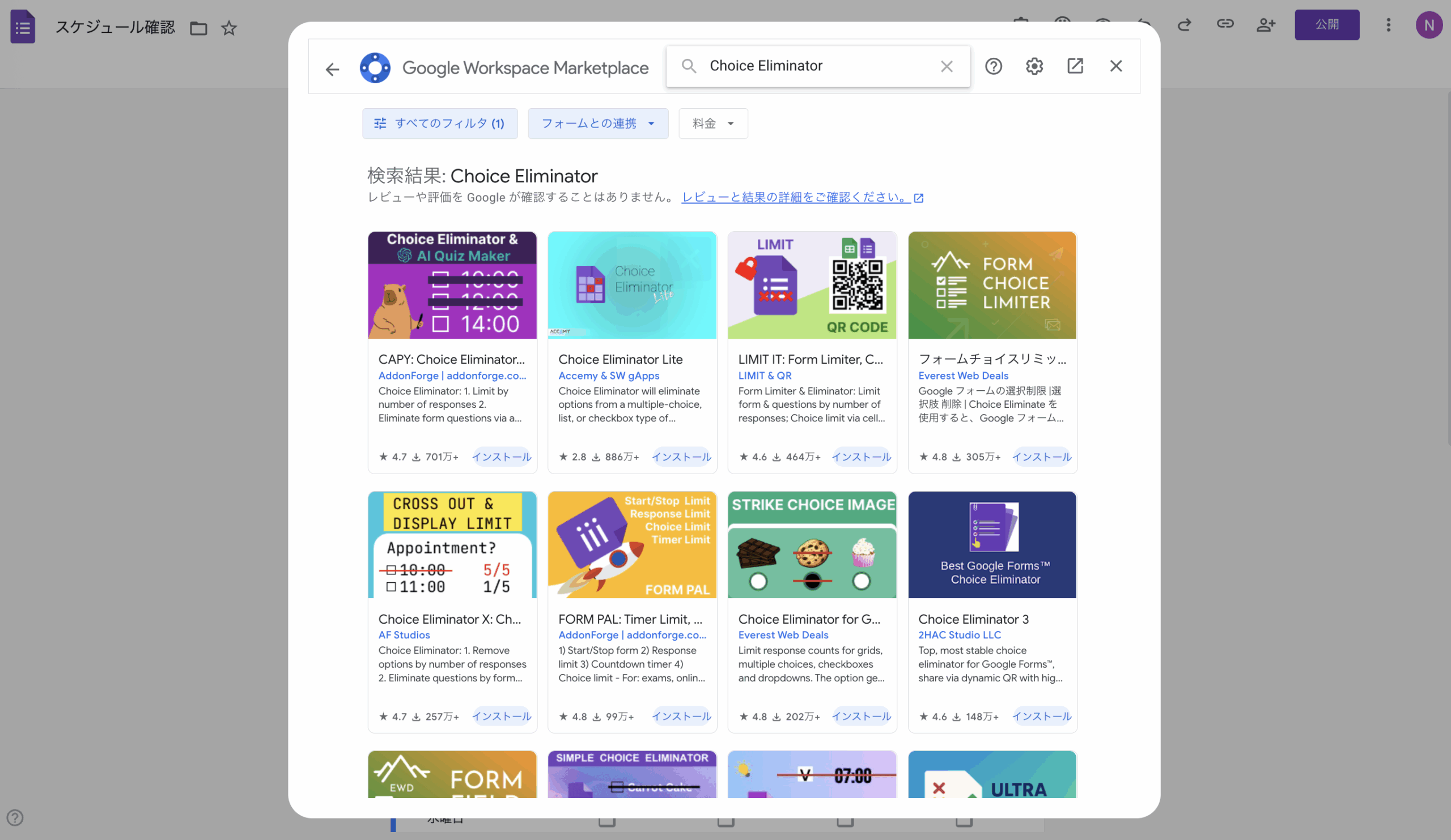 Choice Eliminatorは、Googleフォームに追加して使えるアドオンで、特定の条件に基づいて選択肢や回答数を制限できるツールです。Googleフォームの標準機能ではありませんが、無料で使えて、ダウンロードとインストールも簡単です。