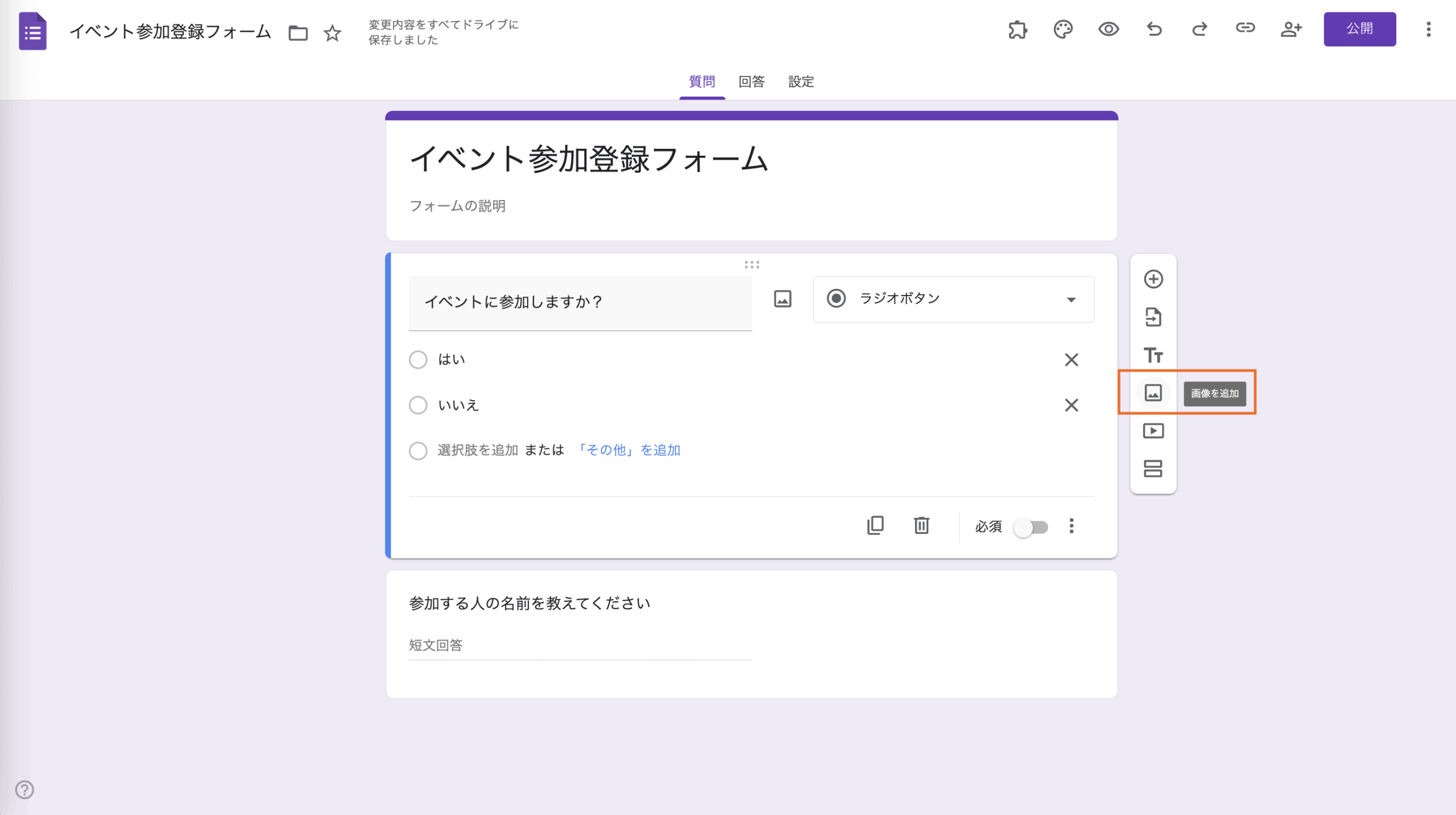 フォームを作成しているパソコンやタブレットにQRコード画像を保存できたら、Googleフォームの画像挿入機能を使って、QRコードをフォーム内に追加します。画面右側のツールバーにある画像アイコンをクリックし、先ほど保存したQRコード画像を選んでください。