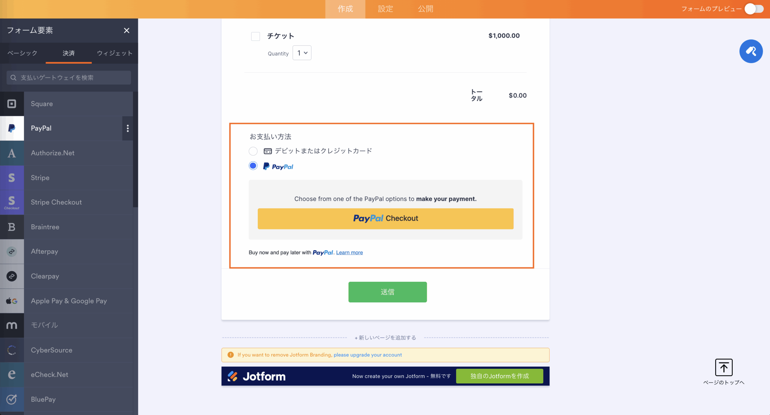 JotformのフォームにPayPalを追加する方法は以下の通りです: