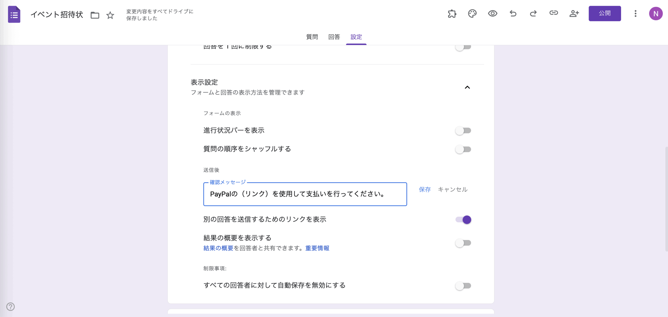 続いて、画面を下にスクロールして表示セクションを開きます。送信後の設定にある、確認メッセージ欄に、支払いの案内文とPayPalのリンクを入力しましょう。最後に保存をクリックして完了です。