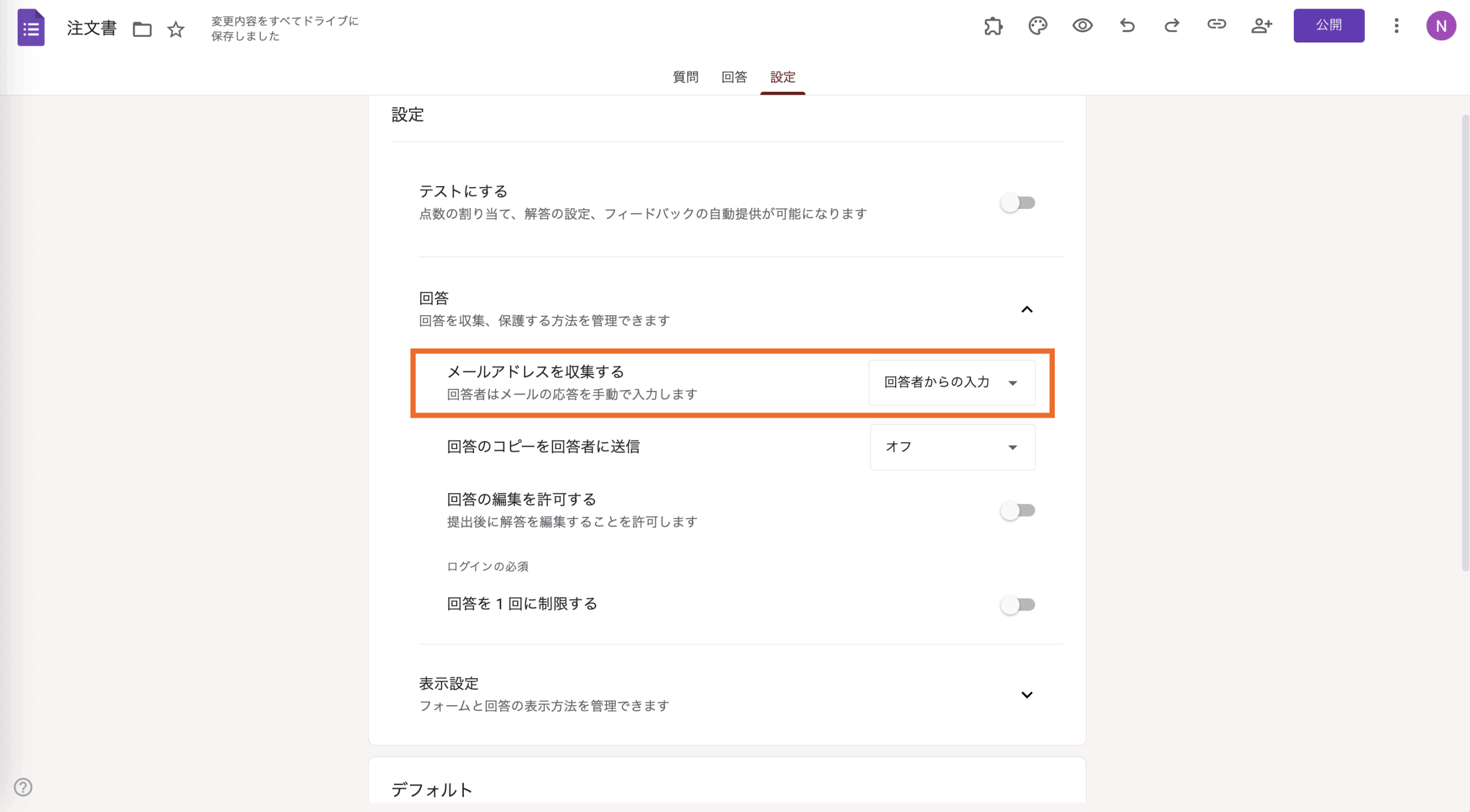 設定タブのメールアドレスを収集する機能を使うと、フォームの先頭にメールアドレス記入欄が設置されます。回答者がGoogleアカウントでログインしていれば、メールアドレスは自動で反映されます。