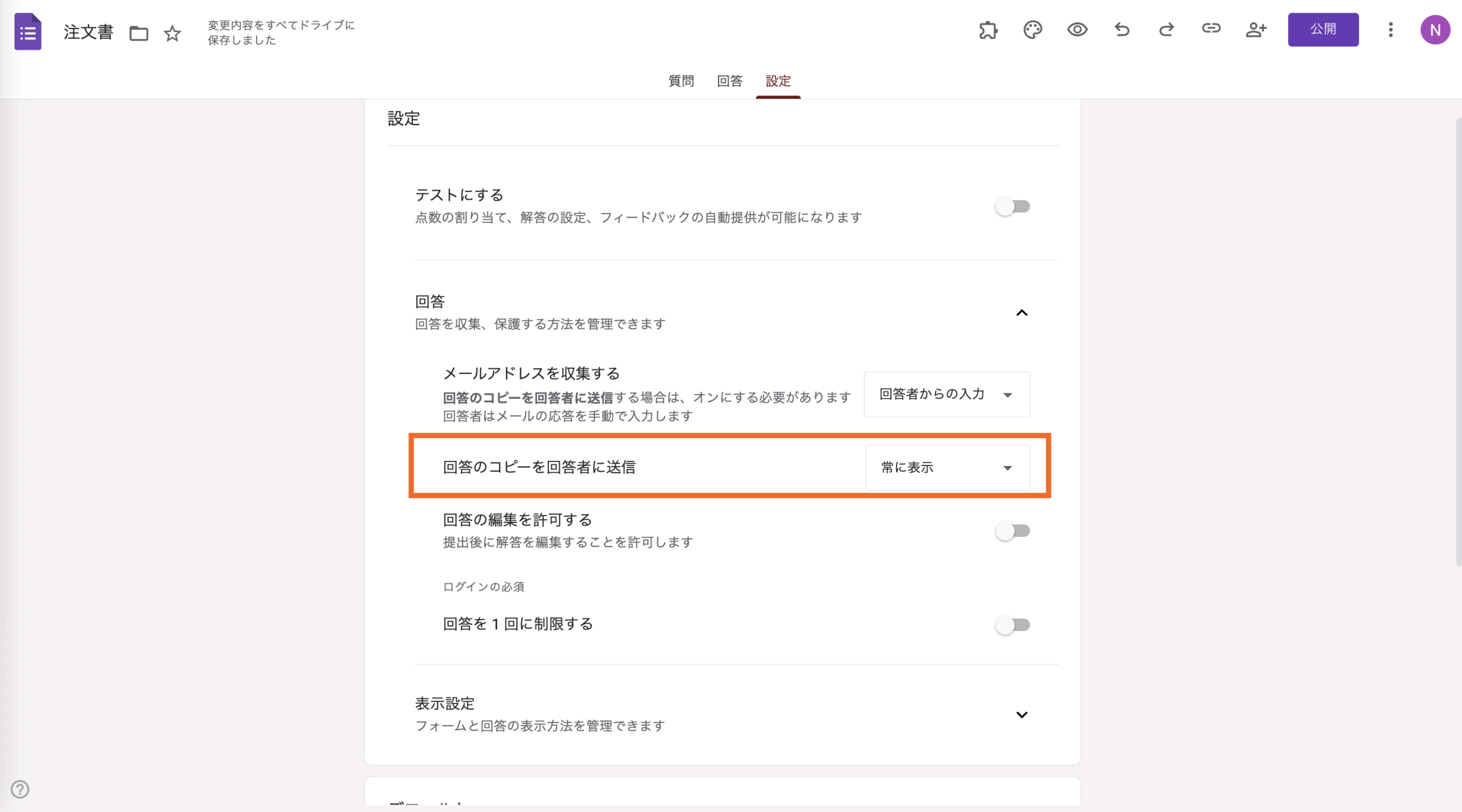 この設定を有効にすると、回答者はフォームを送信した後に内容を編集できなくなります。特にクイズなどの用途では、テスト中にスマートフォンなどに再びアクセスできるようになった後で答えを変更する、といった不正を防ぐのに効果的です。