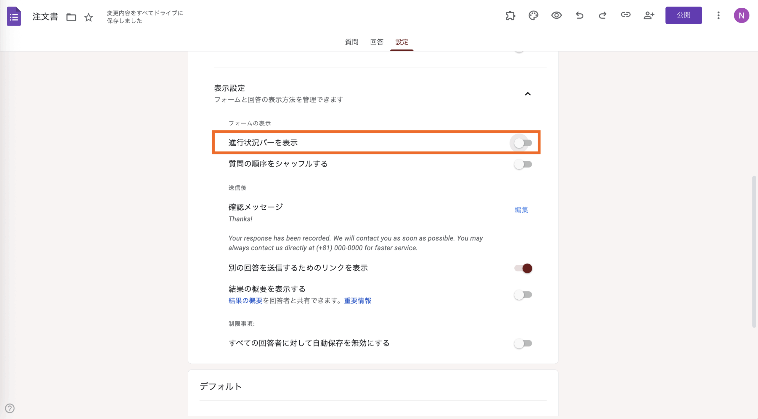 幸い、Googleフォームには進行状況バーを表示するというオプションがあります。この機能を使えば、回答者はフォームのどこまで進んでいるのかをひと目で把握できます。フォームの完了率を上げたいときや、最後まで回答してもらいたいときにとても有効な機能です。