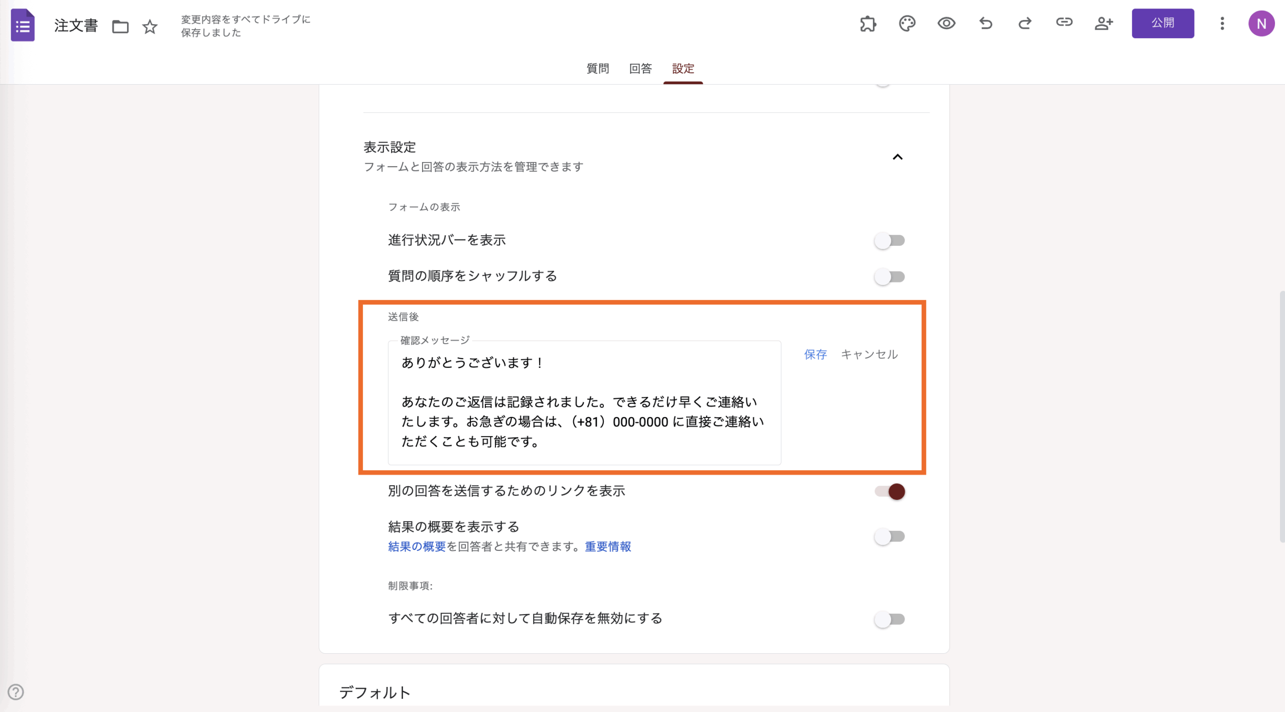 初期設定では「ご回答ありがとうございます。」と表示されますが、回答送信後のメッセージは、ほんのひと言の中に気遣いやブランドの印象を込めるチャンスです。リンクや割引情報、ちょっとした励ましの言葉を添えてみてはどうでしょうか。