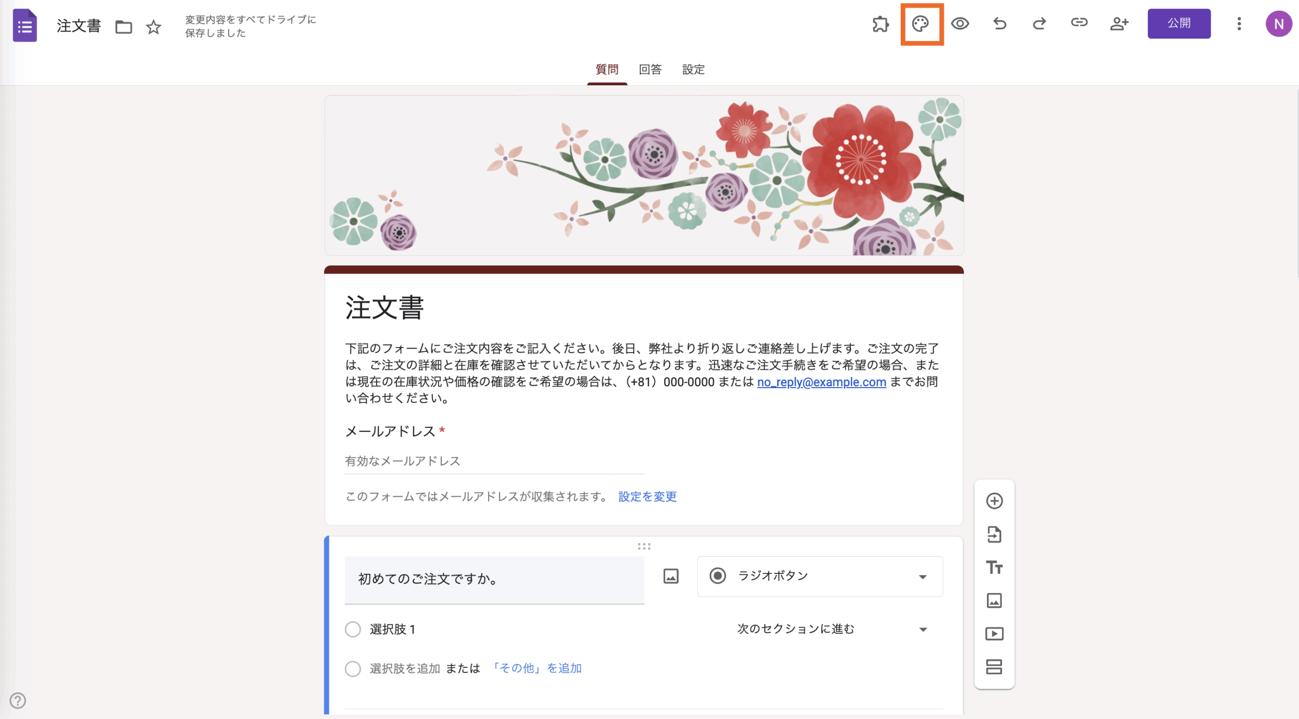 フォームの見た目や雰囲気は、テーマをカスタマイズすることで自由に変えることができます。画面上部にあるパレットのアイコンをクリックすると、デザインを調整するためのオプションが表示されるので、フォントや色、ヘッダー画像などを変更して、あなたのフォームをより魅力的に仕上げましょう。
