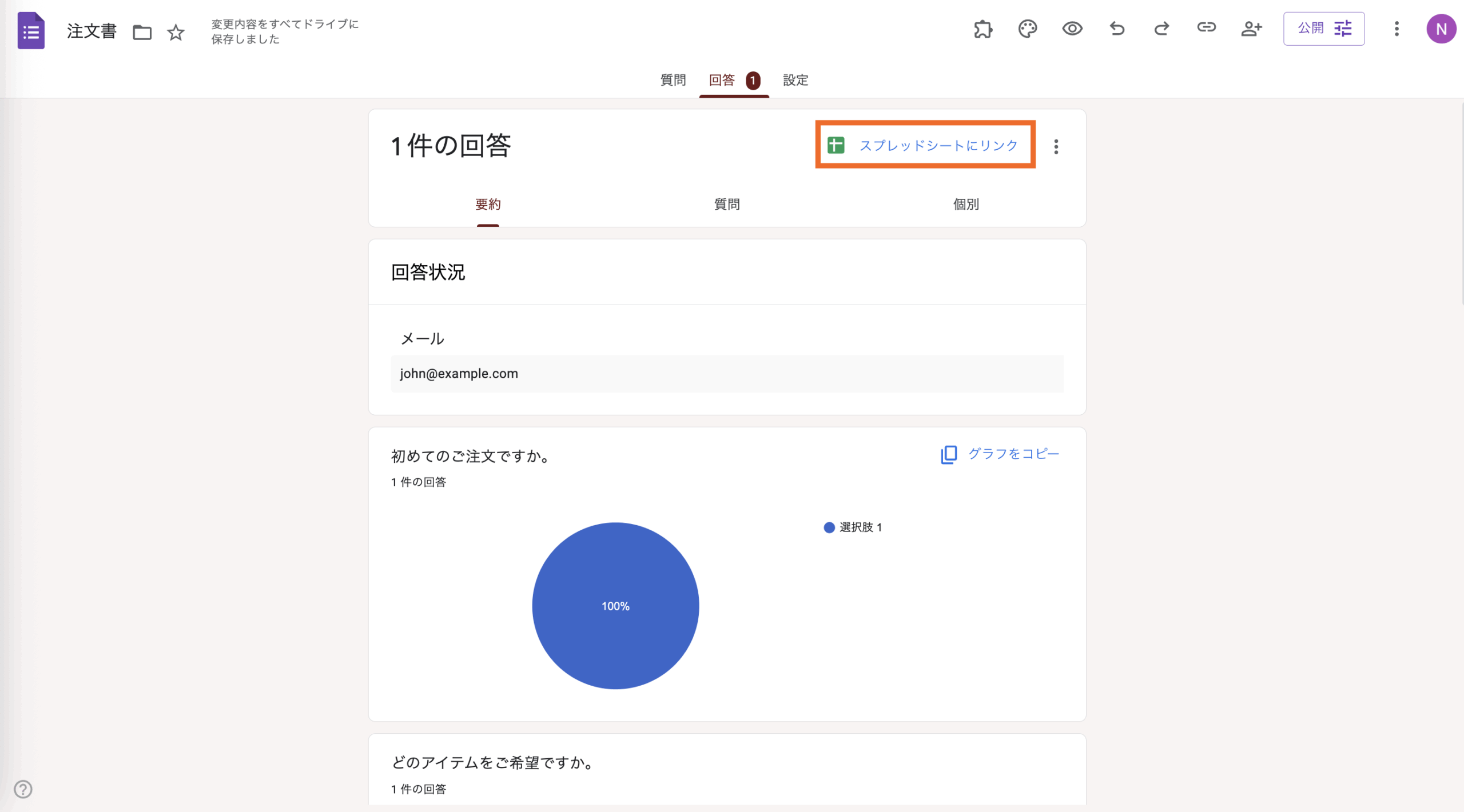 フォーム上部にある回答タブでは、誰がどのように回答したかを確認できます。さらにそのデータを活用してレポートを作成したい場合は、Google スプレッドシートを使うのがおすすめです。スプレッドシートで表示をクリックすると、回答データをGoogleシートで管理・分析できます。