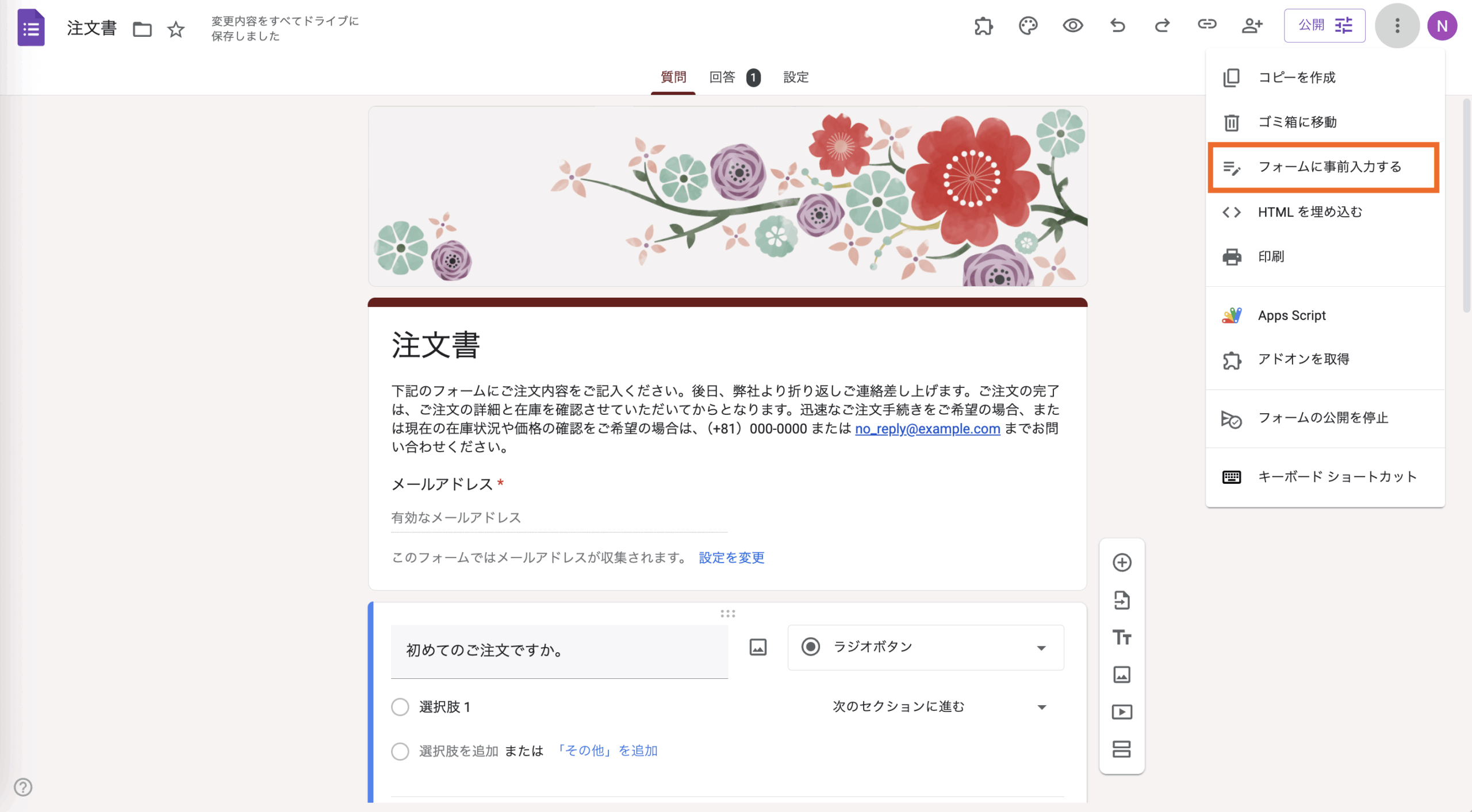 フォーム画面の縦に三つに並んだドットをクリックし、事前入力用リンクを取得を選択すれば、フォームの一部に事前に入力された回答を設定できます。