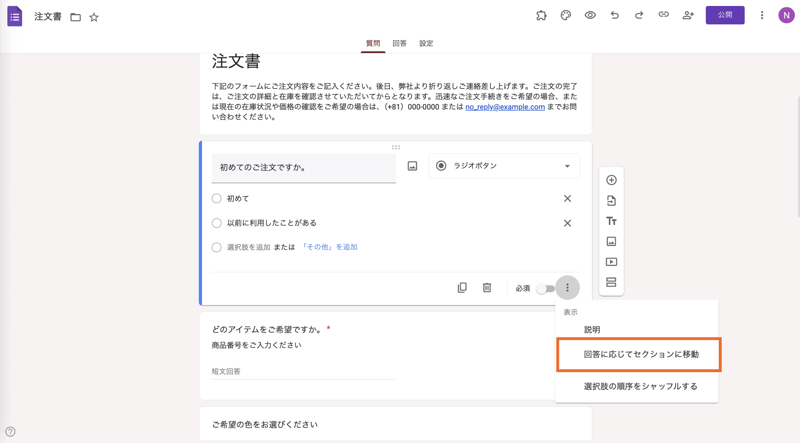 セクションの使い方をマスターしたら、条件付きロジックに挑戦しましょう。選択式やドロップダウン質問を使うことで、回答内容に応じて異なるセクションへ誘導できます。実際に操作するには、質問をクリックし、右下の三点メニューを押して、回答によるセクション移動を選択してください。各回答の横に移動先を選べるドロップダウンが表示されます。