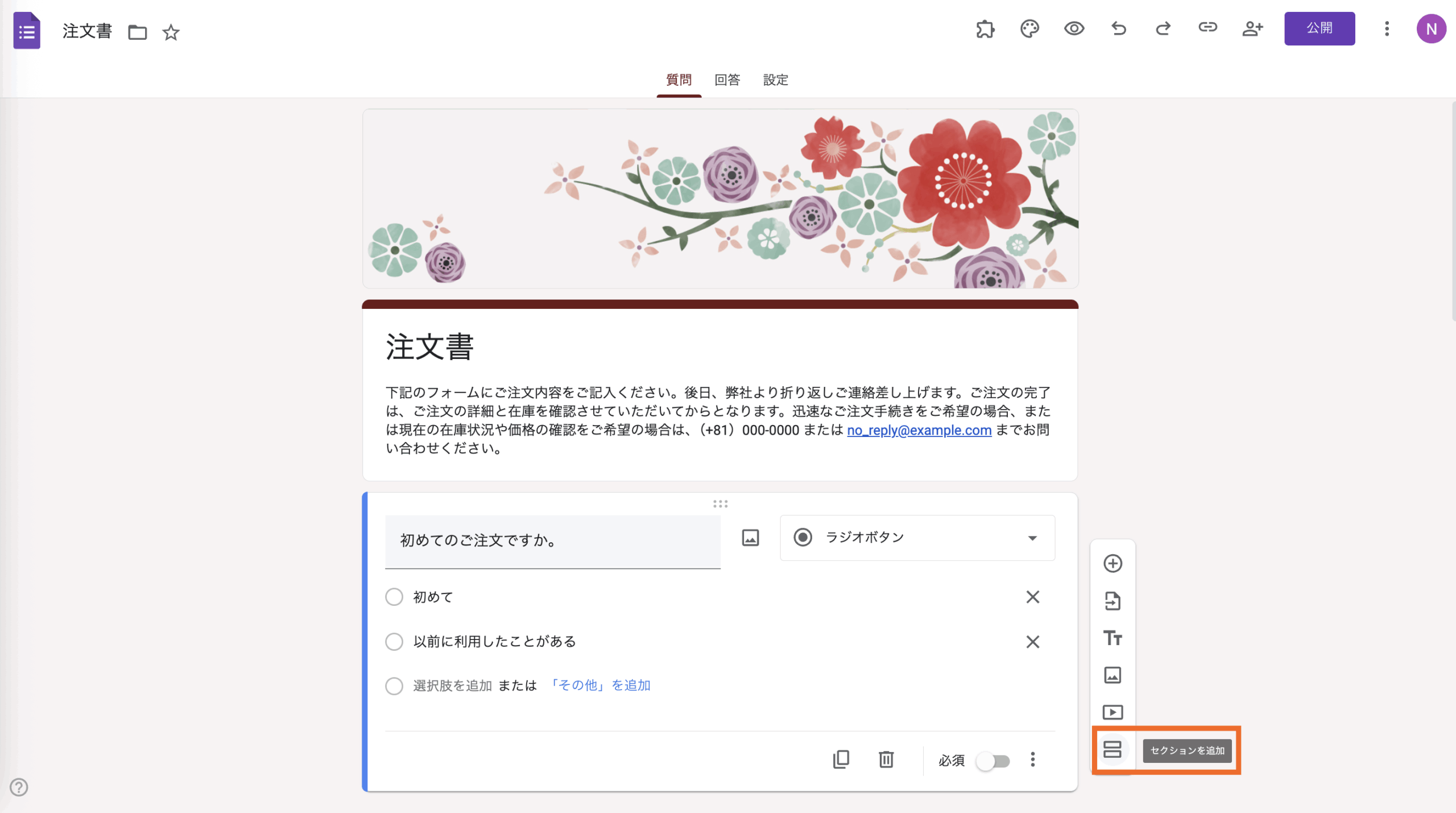 一番下のアイコンを使うと、フォームにセクションを追加できます。セクションでフォームを区切ることで、見た目が整い回答しやすくなります。
