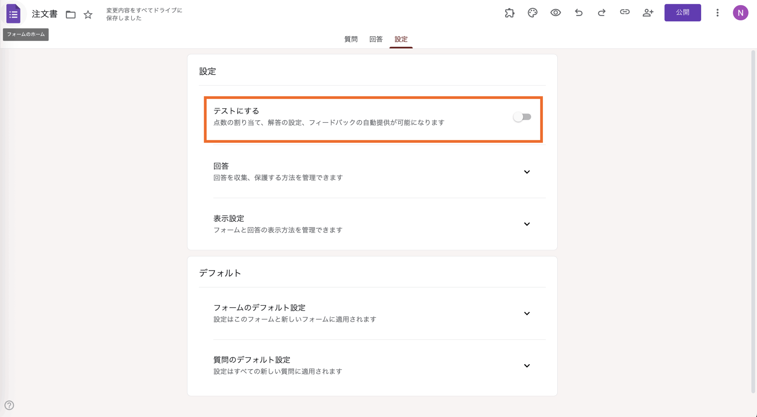 Googleフォームは、先生が授業用のテストを作成するツールとしてもよく使われています。テストにするをオンにすると、クイズ向けの設定がいくつか表示されます。
