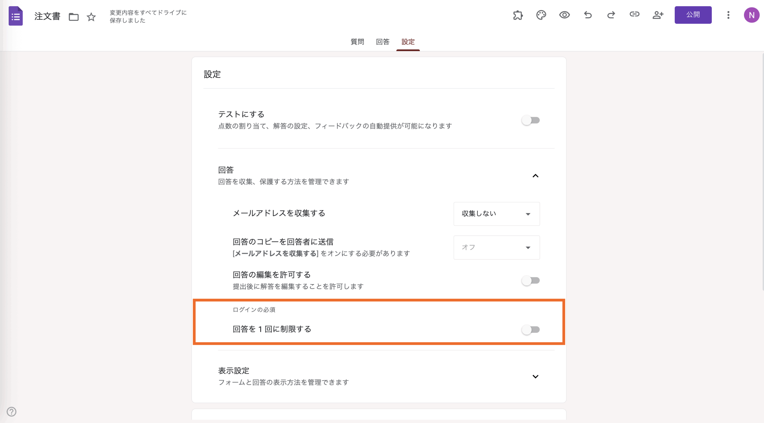回答タブの、1回の回答に制限オプションを有効にすると、同じユーザーがフォームに何度も回答するのを防止できるので、出席確認などで重複回答を避けたいときに役立ちます。