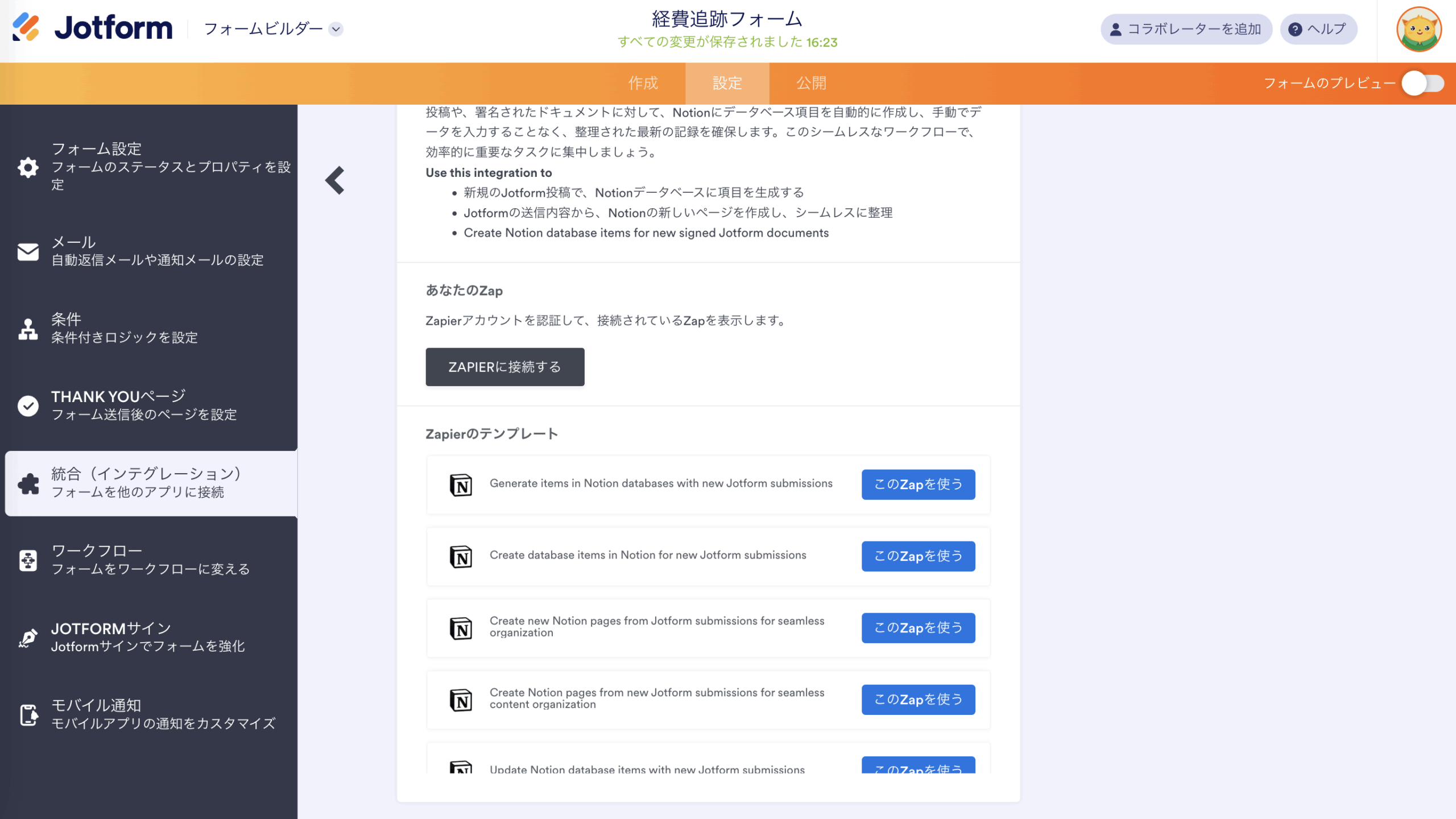 Googleフォームと同様に、JotformもZapierを使って簡単にNotionと連携できます。わずかな設定で、Jotformで作成したフォームの回答をNotionに自動で反映させることが可能です。