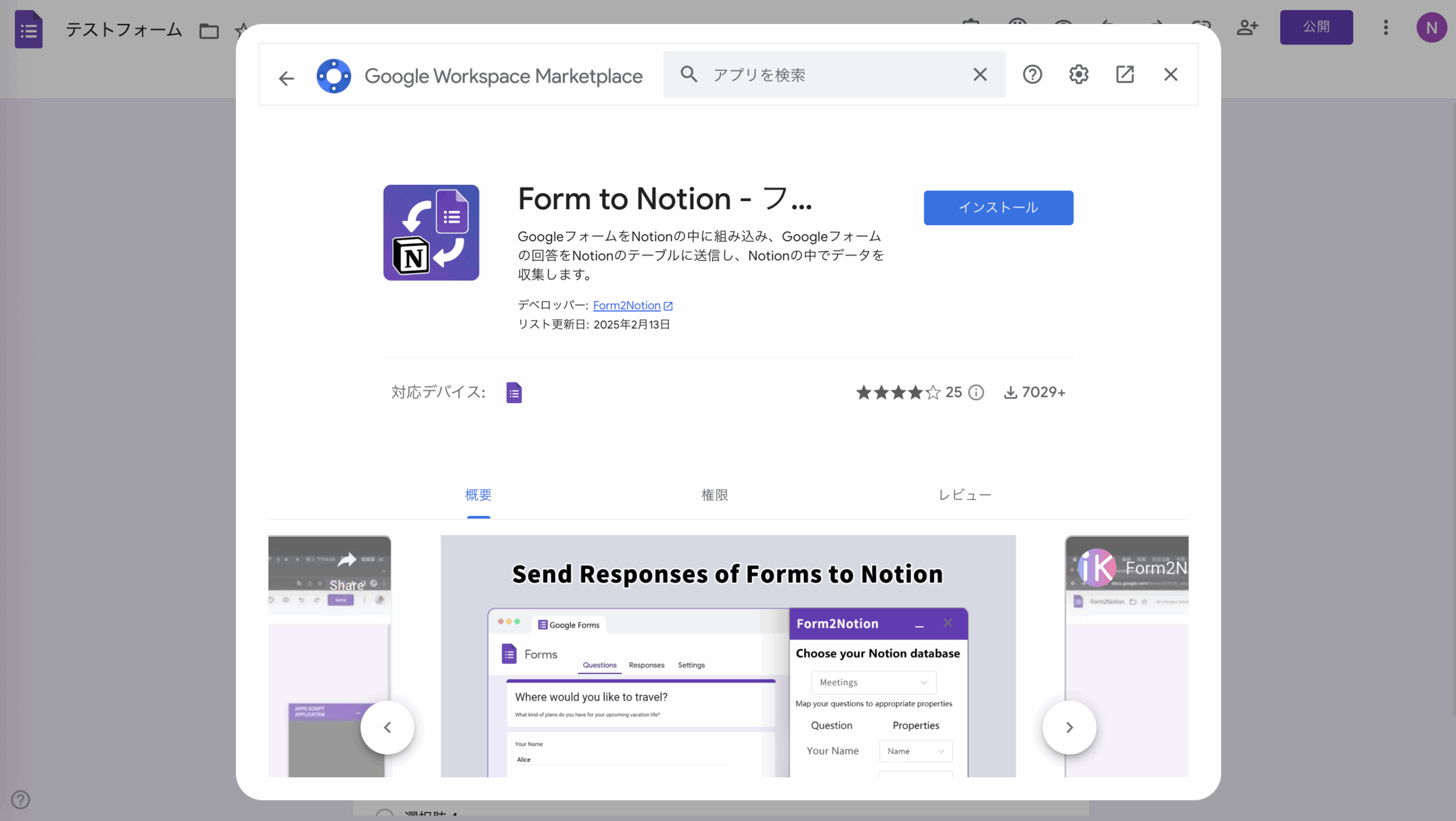 - Form to Notionプラグインをインストールします。インストールが完了すると、Googleからポップアップで確認が表示されます。