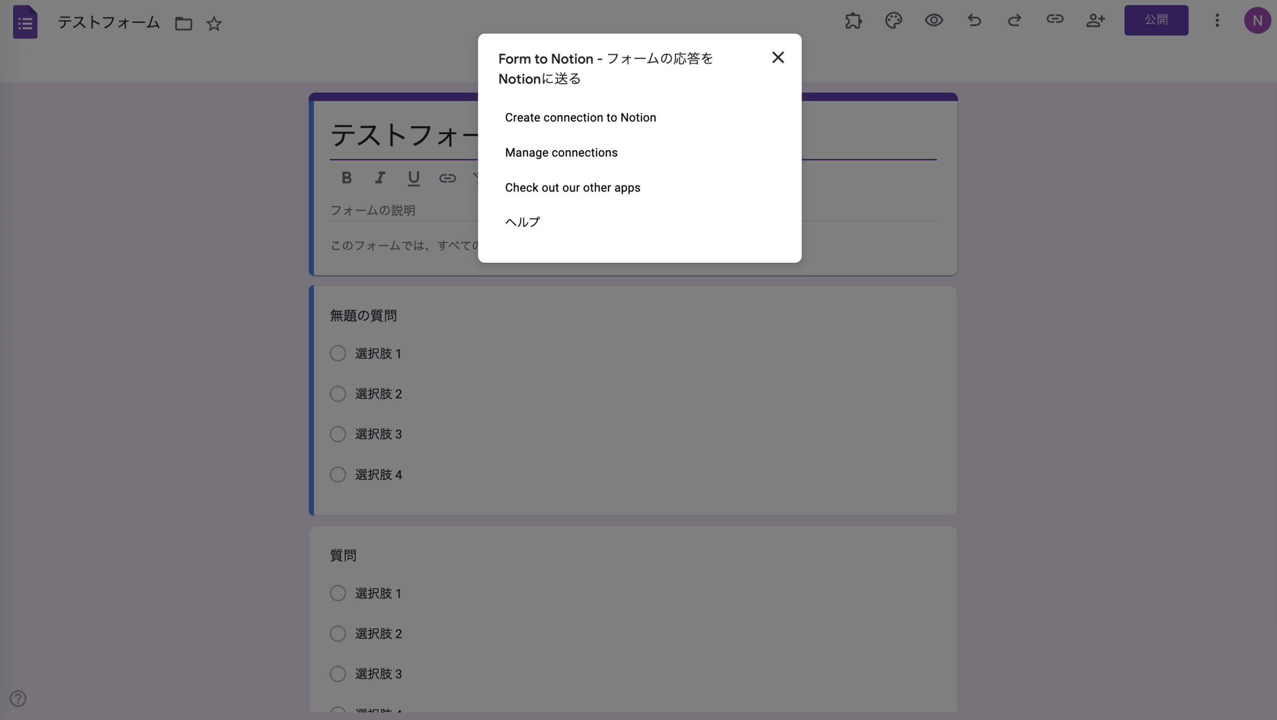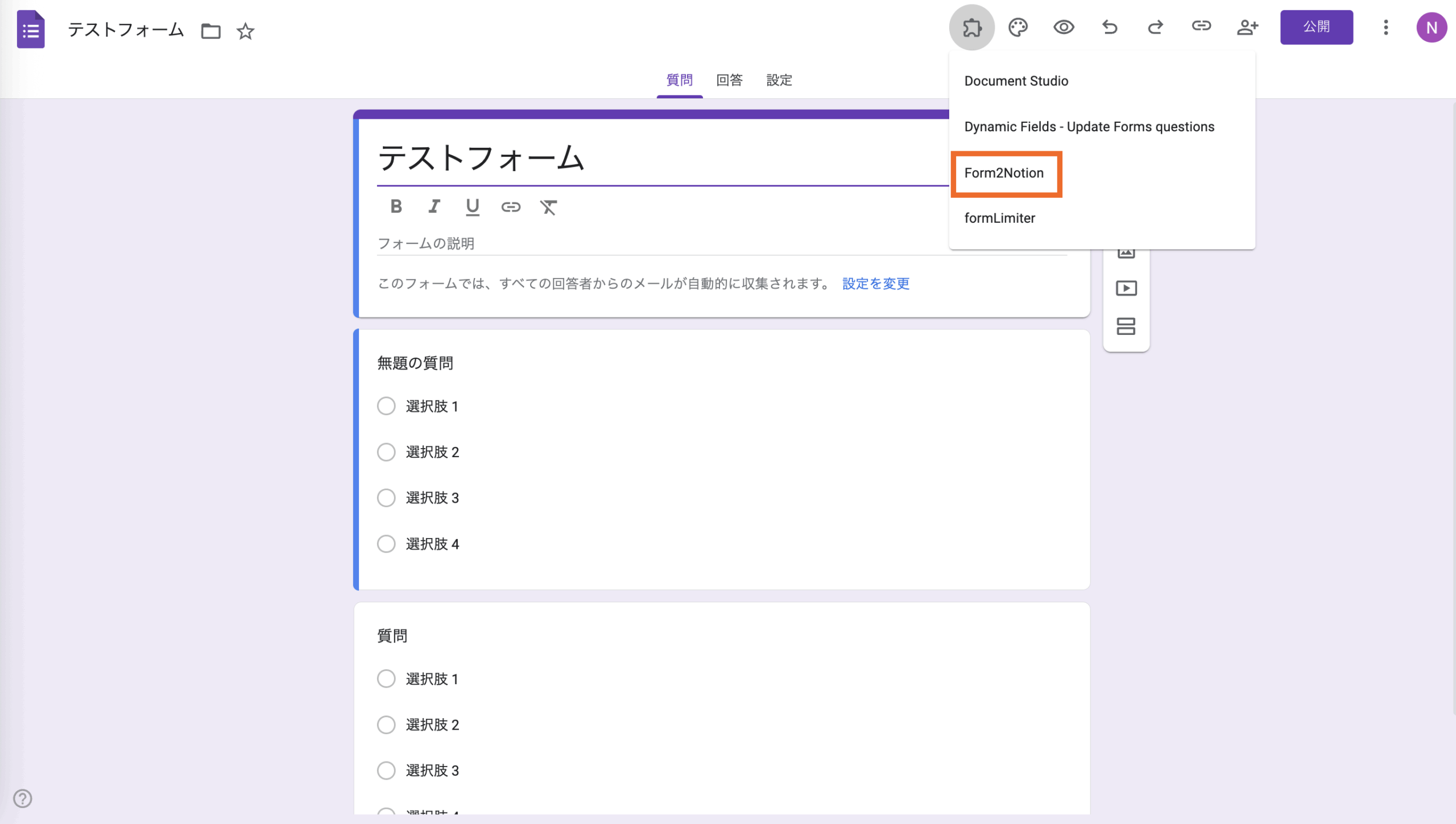 - Googleフォームの右上隅にあるForm to Notionを選択します。