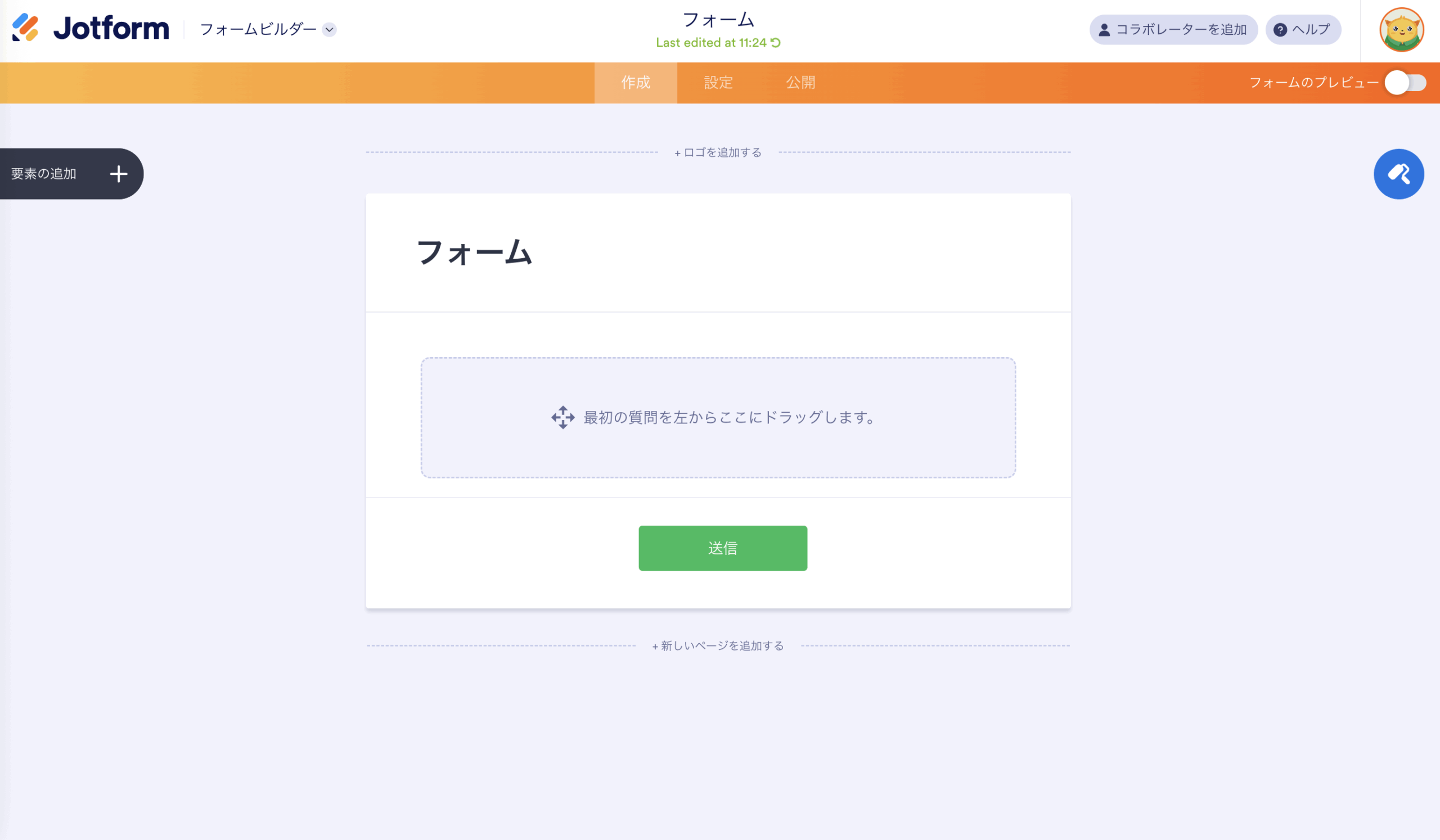 - フォームビルダーの左側にある要素の追加 +ボタンを選択し、フォーム要素メニューを開きます。