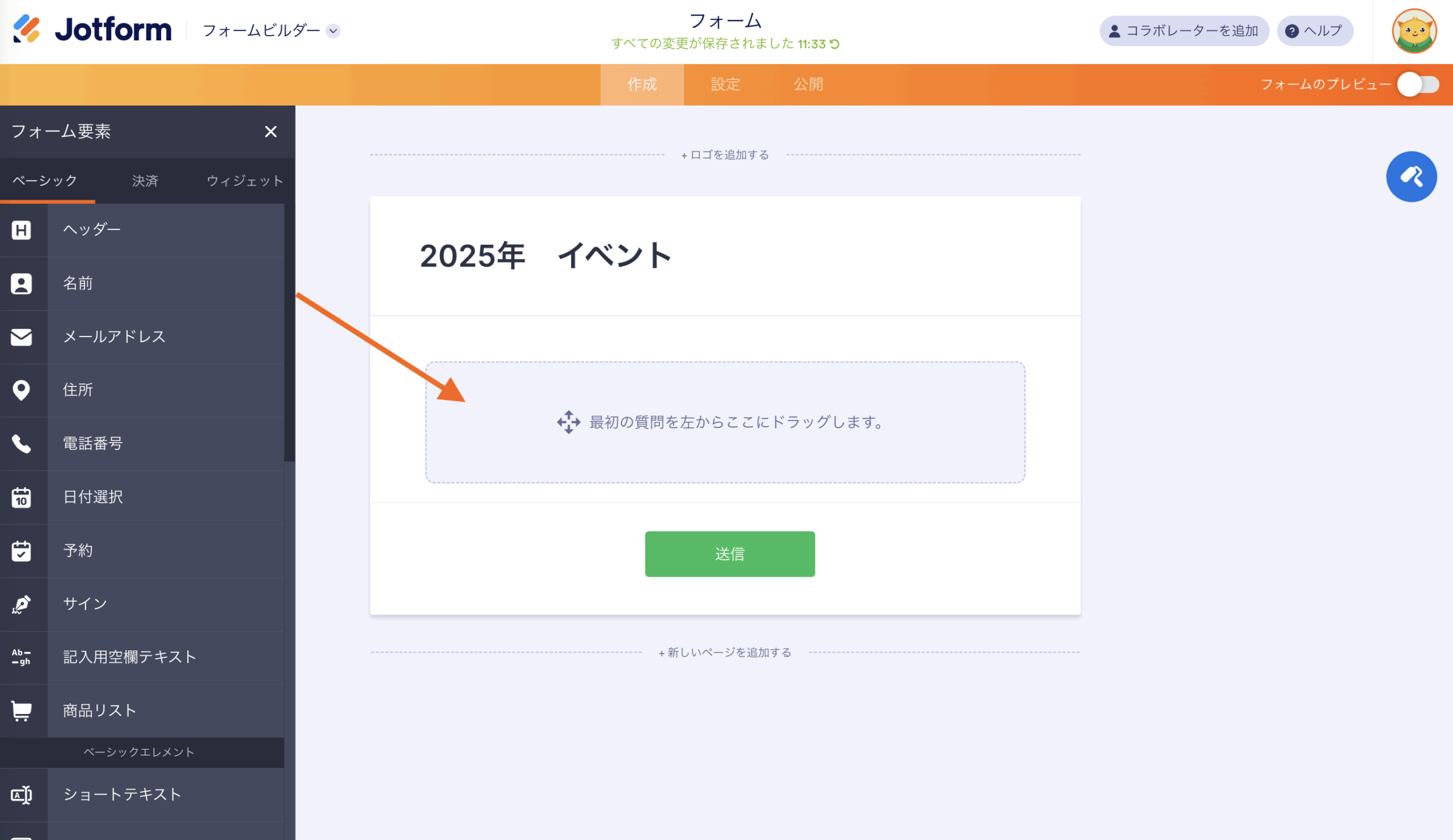 Jotformを使えば、申し込みフォームの作成はわずか数分で完了します。ドラッグ&ドロップ式のフォームビルダーを使って、参加申し込みフォームを作成する手順をご紹介します: