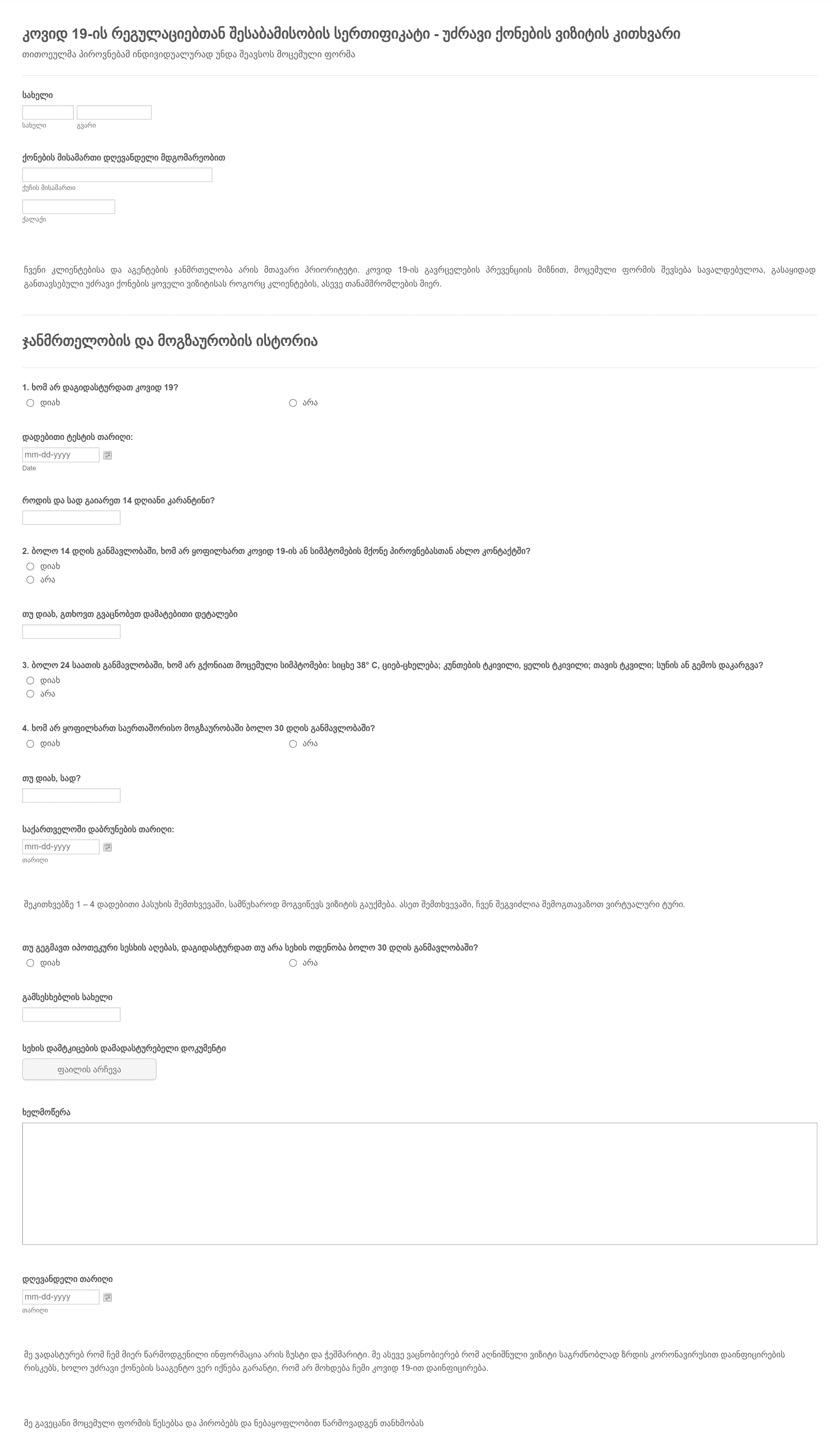 Go to Category:კორონავირუსის გამოხმაურების ფორმებიჯანმრთელობის დეკლარაციის ფორმა