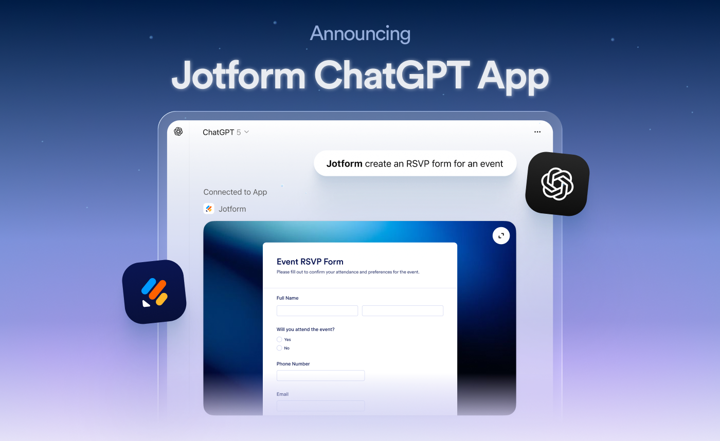 You can now create, edit, and redesign Jotform forms right inside ChatGPT — simply by describing what you want. When responses flow in, you can use ChatGPT to review submissions, spot patterns, and get recommendations based on your real data.