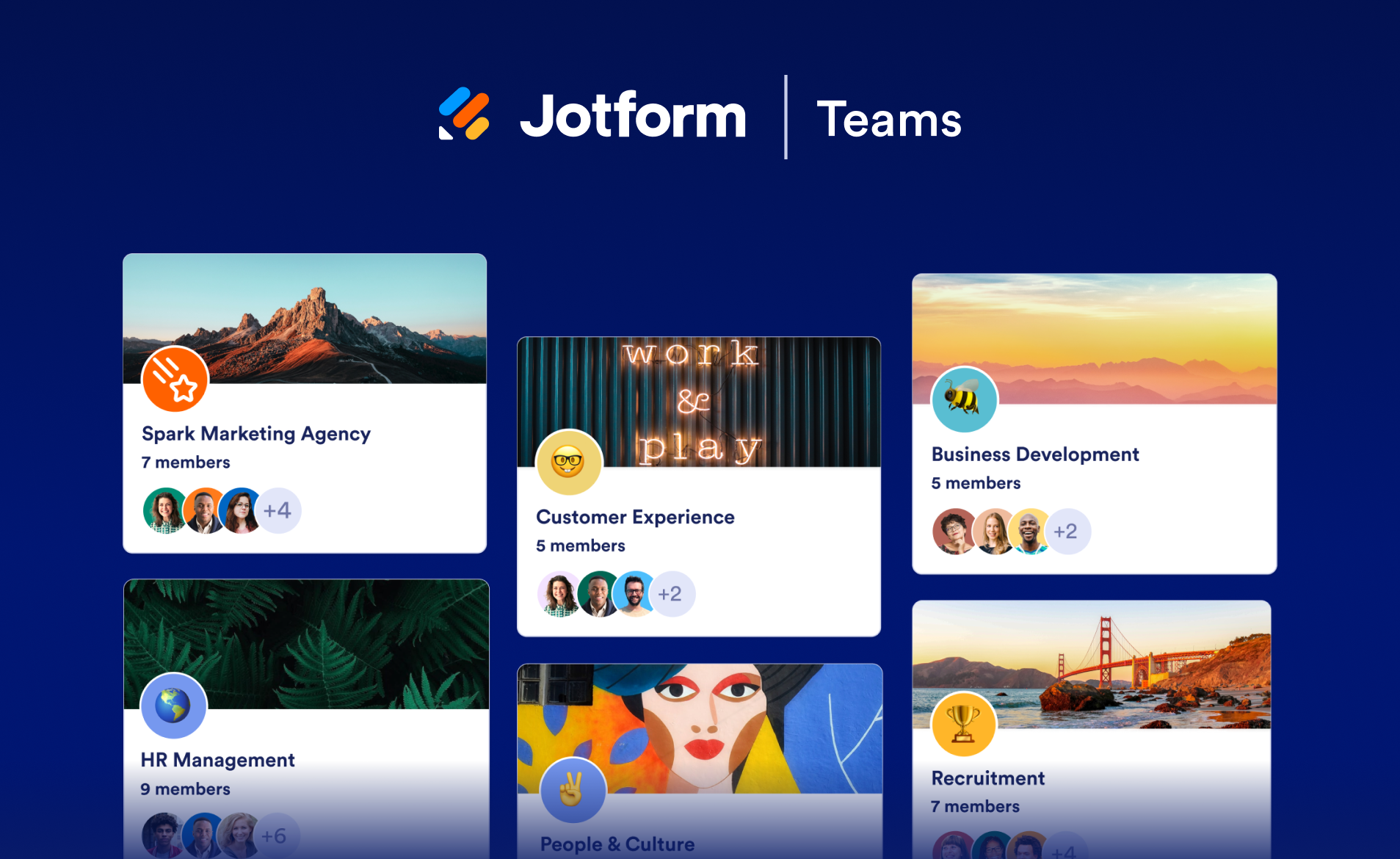 Introducing Jotform Teams, shared workspaces for forms, data, and more. Jotform Teams gives Enterprise users the power to create shared online workspaces for departmental and cross-functional work. New role-based access controls and activity monitoring keep data secure and team members up to date.