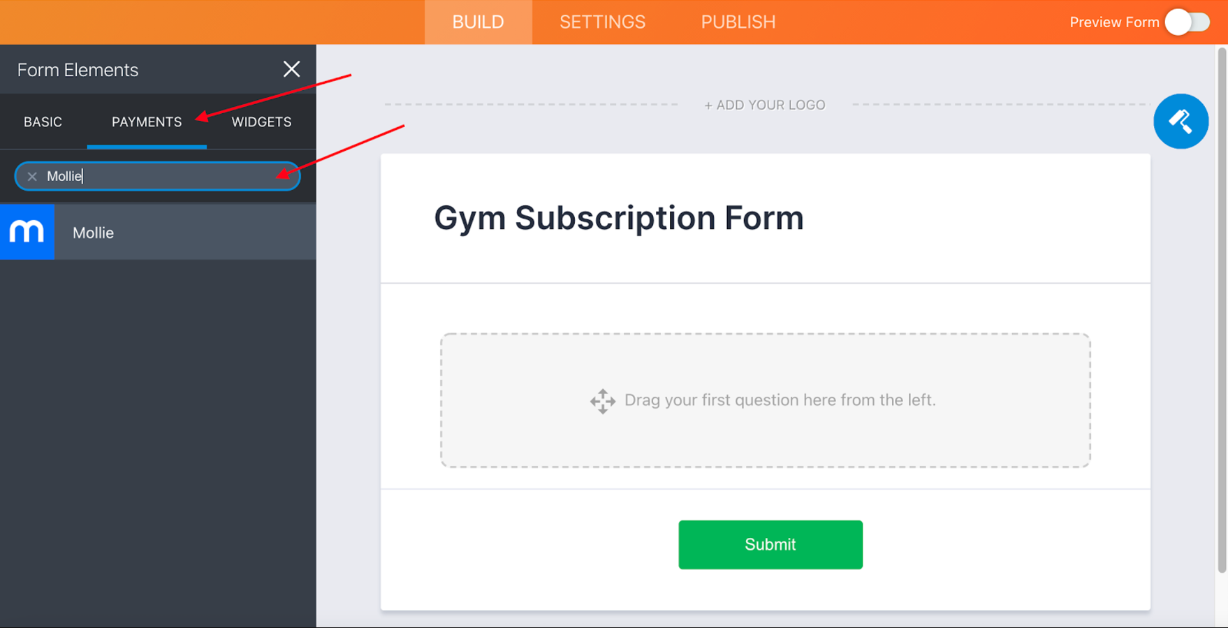 - Nadat u een online formulier hebt gemaakt, zoekt en selecteert u de Mollie-integratie onder het tabblad Betalingen in het menu Formulierelementen