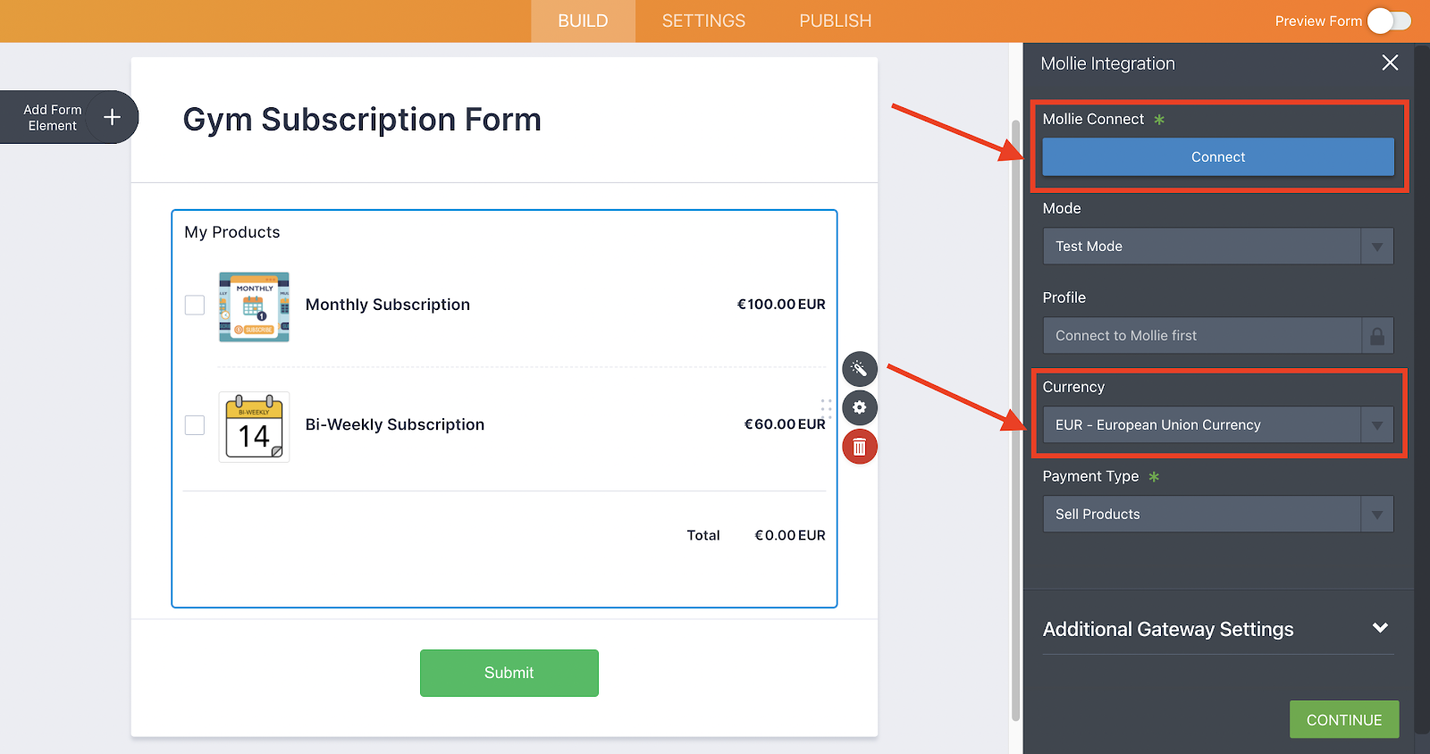 - Stel in het menu Mollie Integration de valuta in op euro’s (weergegeven in de instellingen als European Union Currency), zet de integratie in de testmodus en klik op de knop Connect (verbinden) om uw Mollie-account te koppelen aan het online betaalformulier dat u hebt gemaakt.