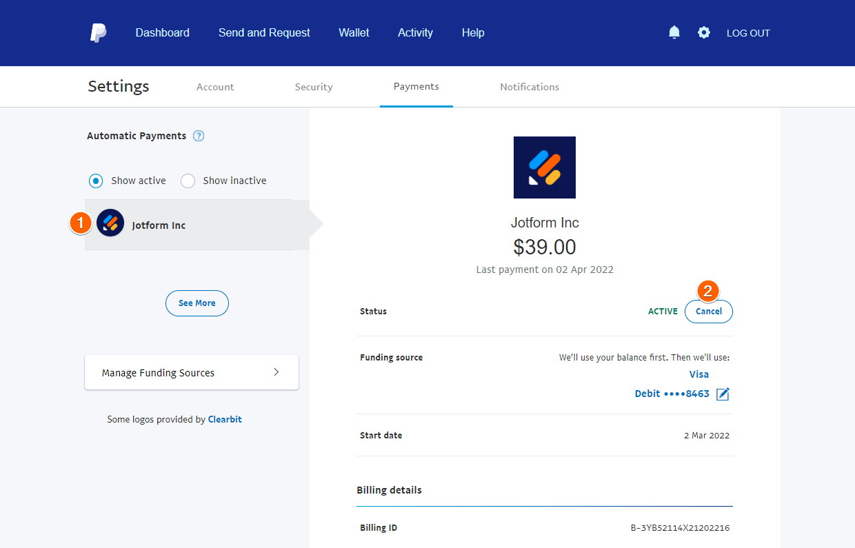 Als op de factureringspagina staat dat u contact moet opnemen met Jotform Support wanneer u uw abonnement annuleert via PayPal of als u wordt verteld dat het handmatig wordt geannuleerd, raden we u aan uw PayPal-e-mail te controleren als het al dan niet wordt geannuleerd. Anders raden we u aan de annulering handmatig uit te voeren. Dit zijn de stappen: