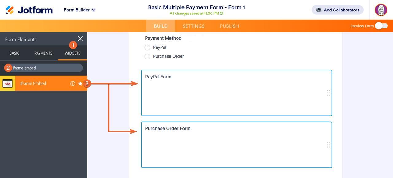 - We zullen dan twee iFrame Embed widgets toevoegen waar de betalingsformulieren PayPal Standard Formulier en Purchase Order Formulier ingebed of geladen zullen worden.
