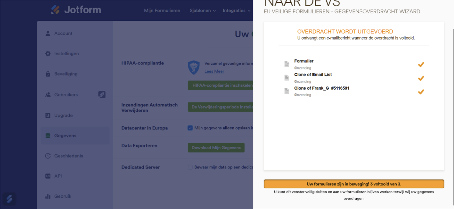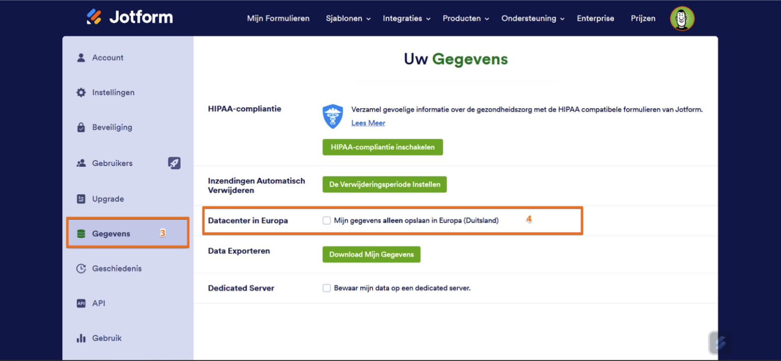 Jotform neemt GDPR-naleving serieus. Als je uit de Europese Unie (EU) komt of zaken doet binnen deze regio, moet je je formulieren en gegevens opslaan in een EU-datacenter. Standaard stelt Jotform automatisch het account dat binnen de EU-regio is gemaakt, in overeenstemming met de GDPR. Als je echter denkt dat je nog niet voldoet aan de GDPR-naleving of wilt worden, zal deze handleiding je daarbij begeleiden.