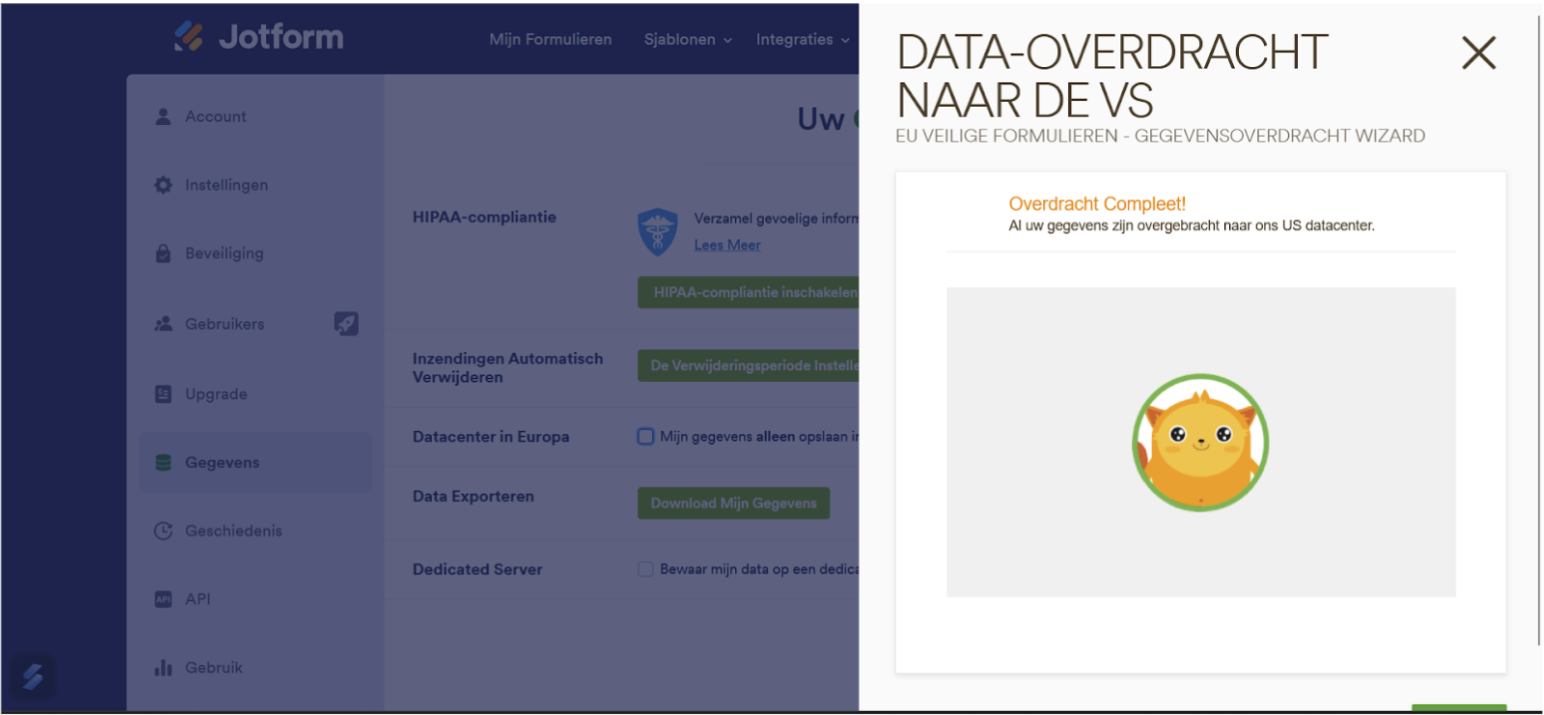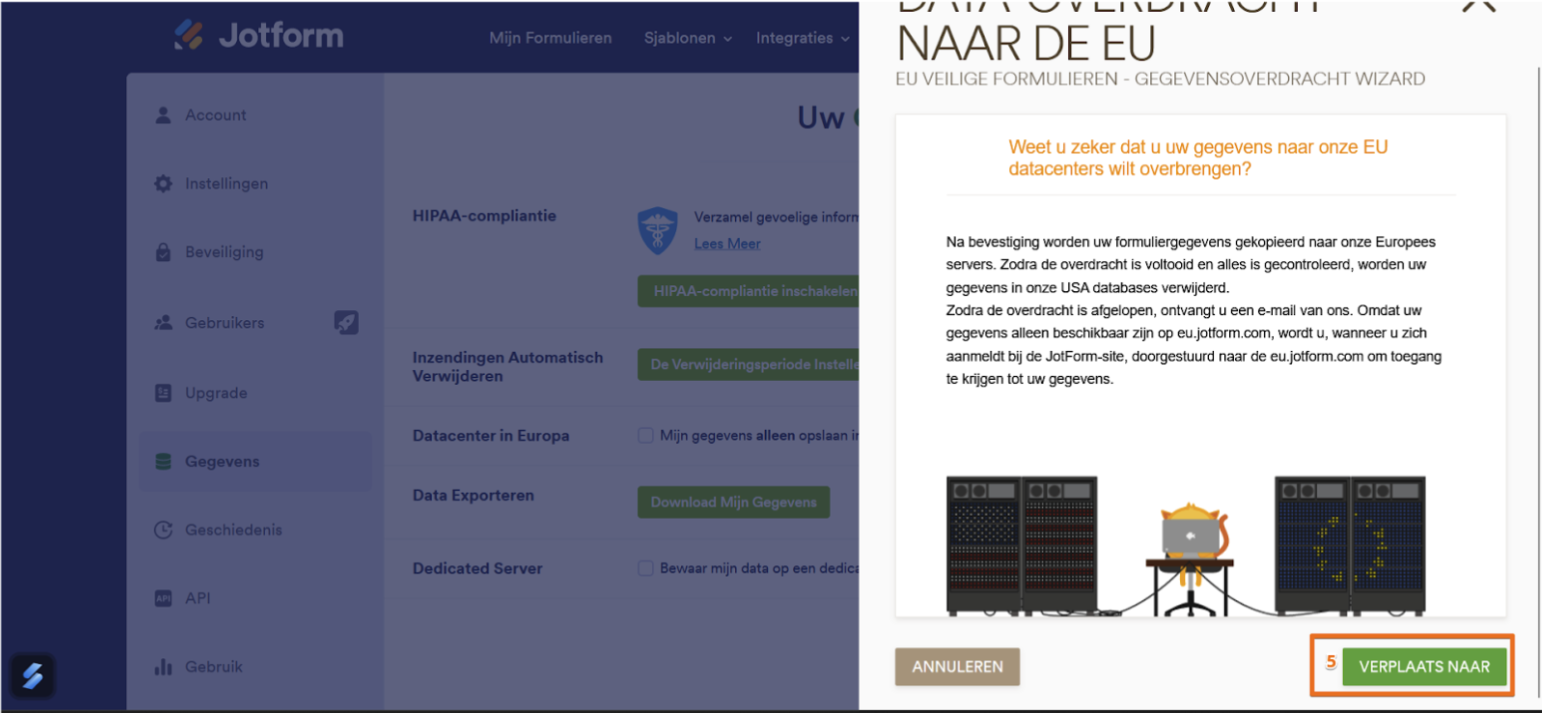- Kies voor de Europees Datacenter optie. Het Transfer Data naar EU-dialoogvenster zou moeten verschijnen.