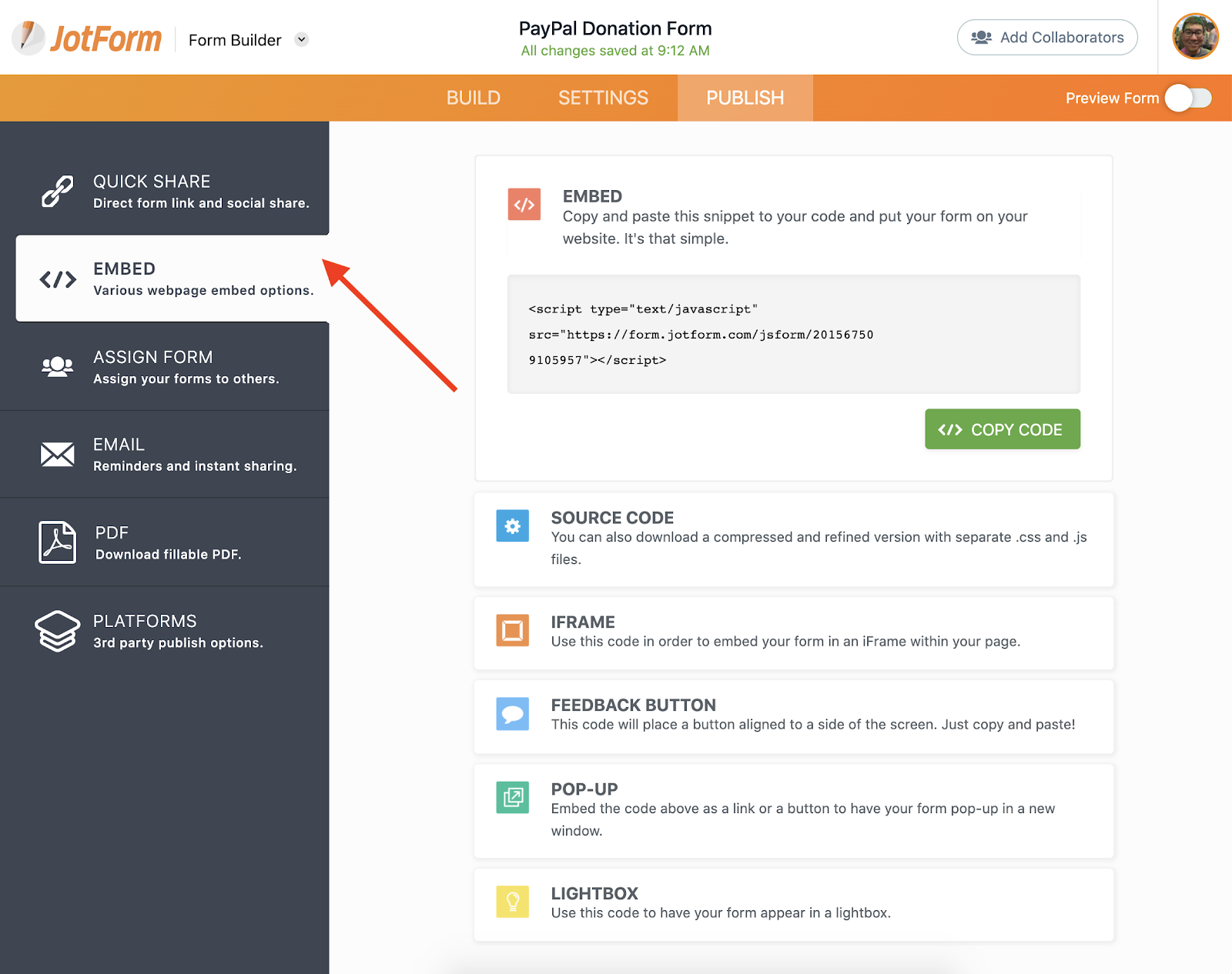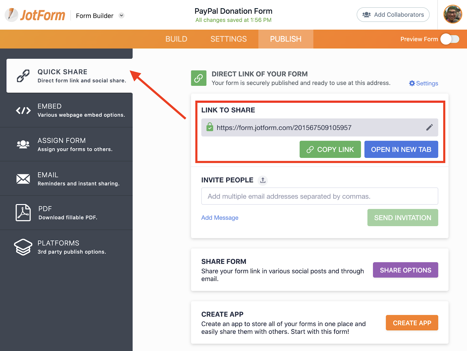 Form-sharing options are all conveniently located under the Publish tab toward the top of Jotform’s Form Builder.